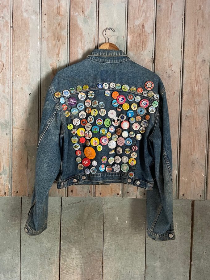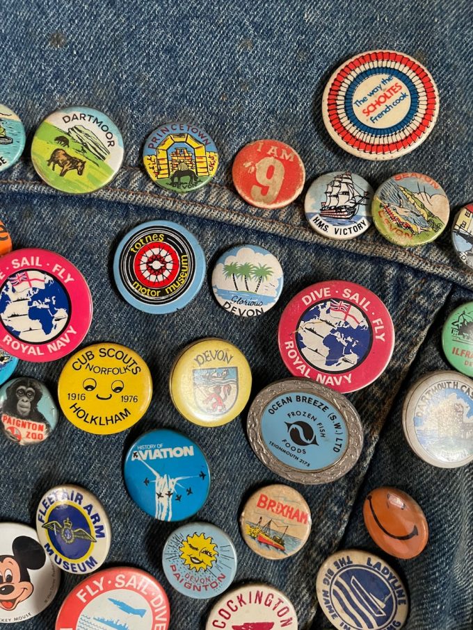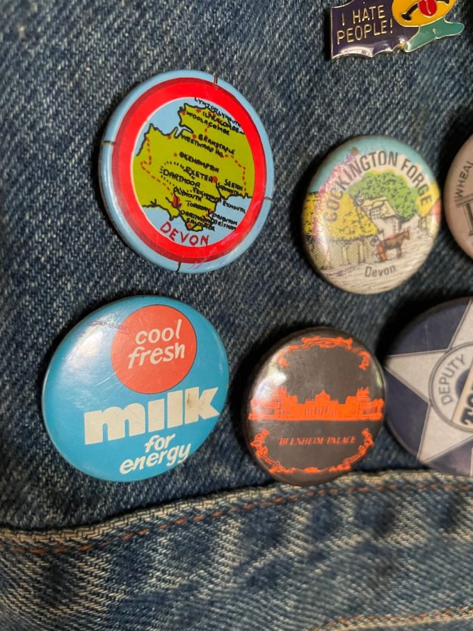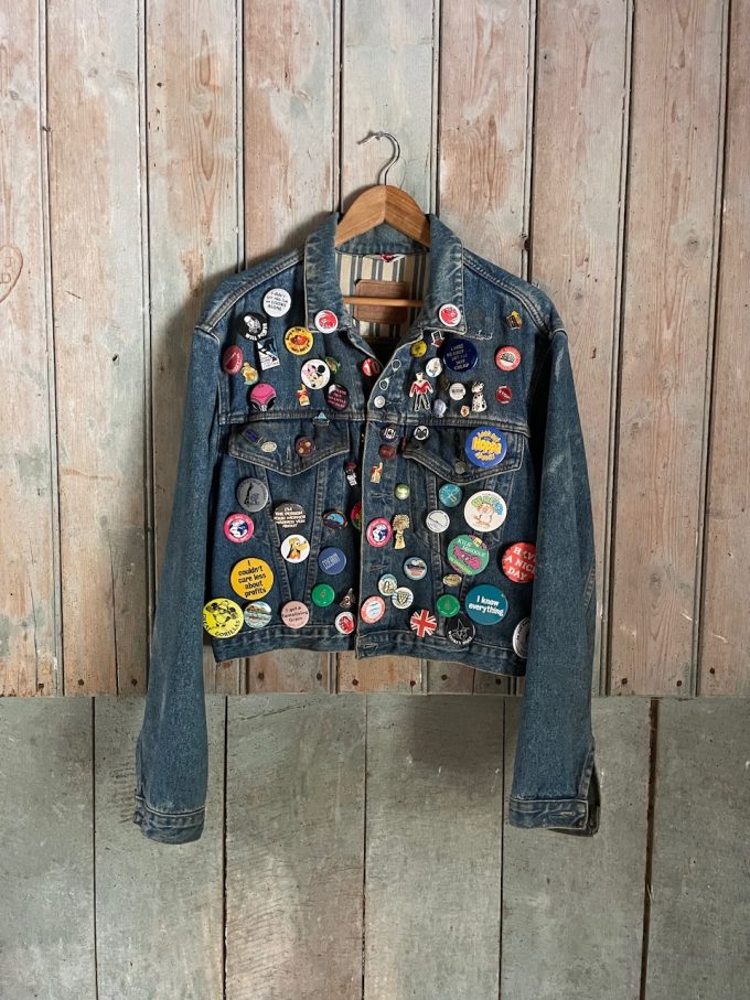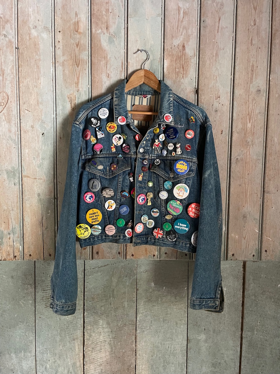 A 1970’s/80’s Levi’s denim jacket adorned with a huge collection of period pin badges.