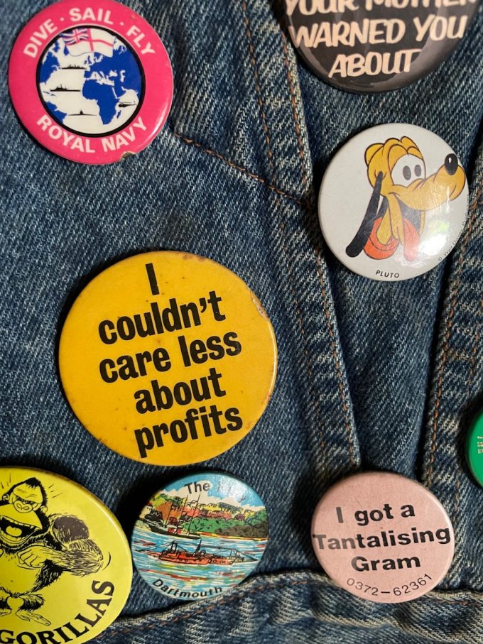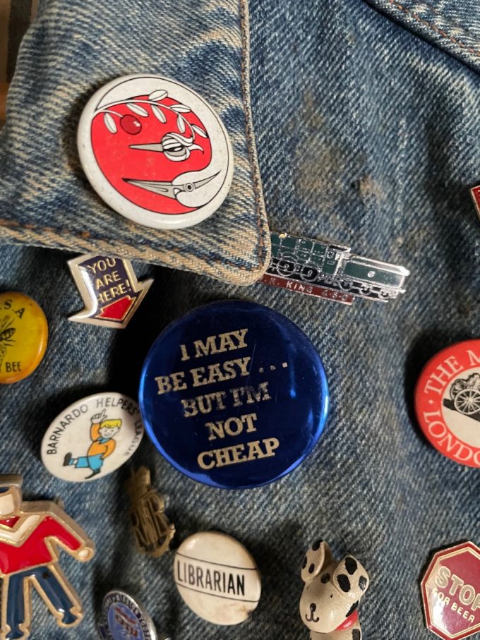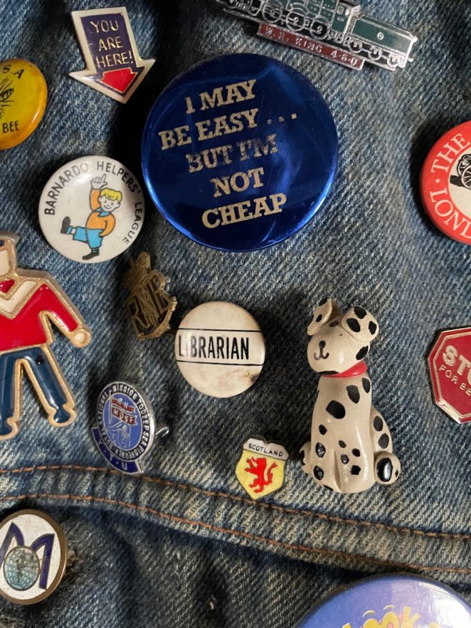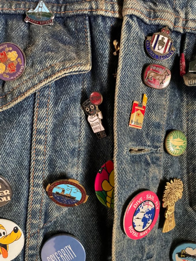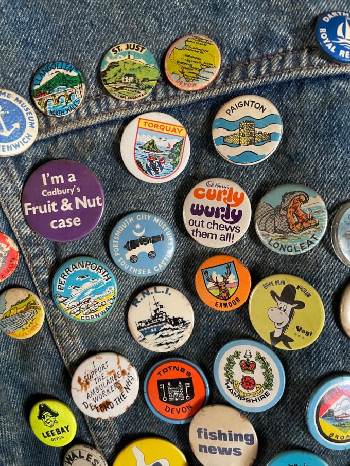 A 1970’s/80’s Levi’s denim jacket adorned with a huge collection of period pin badges.