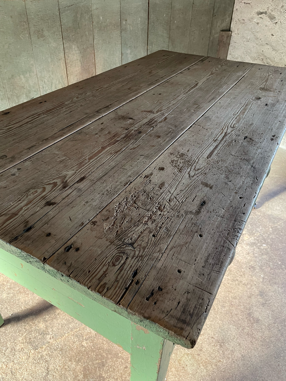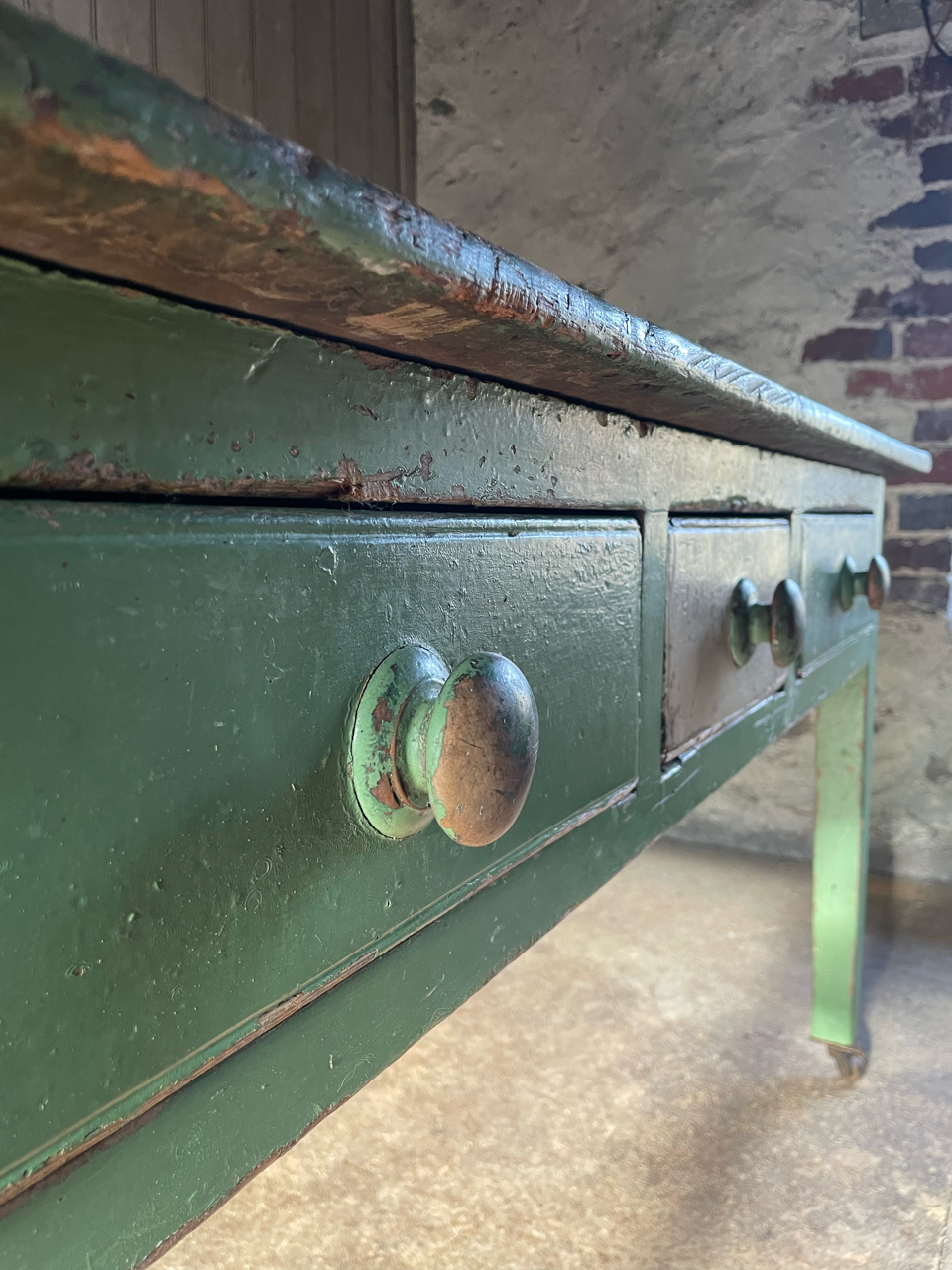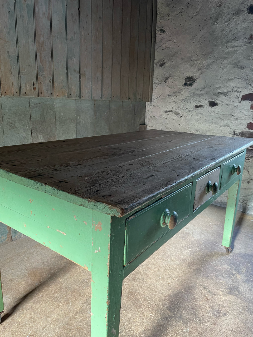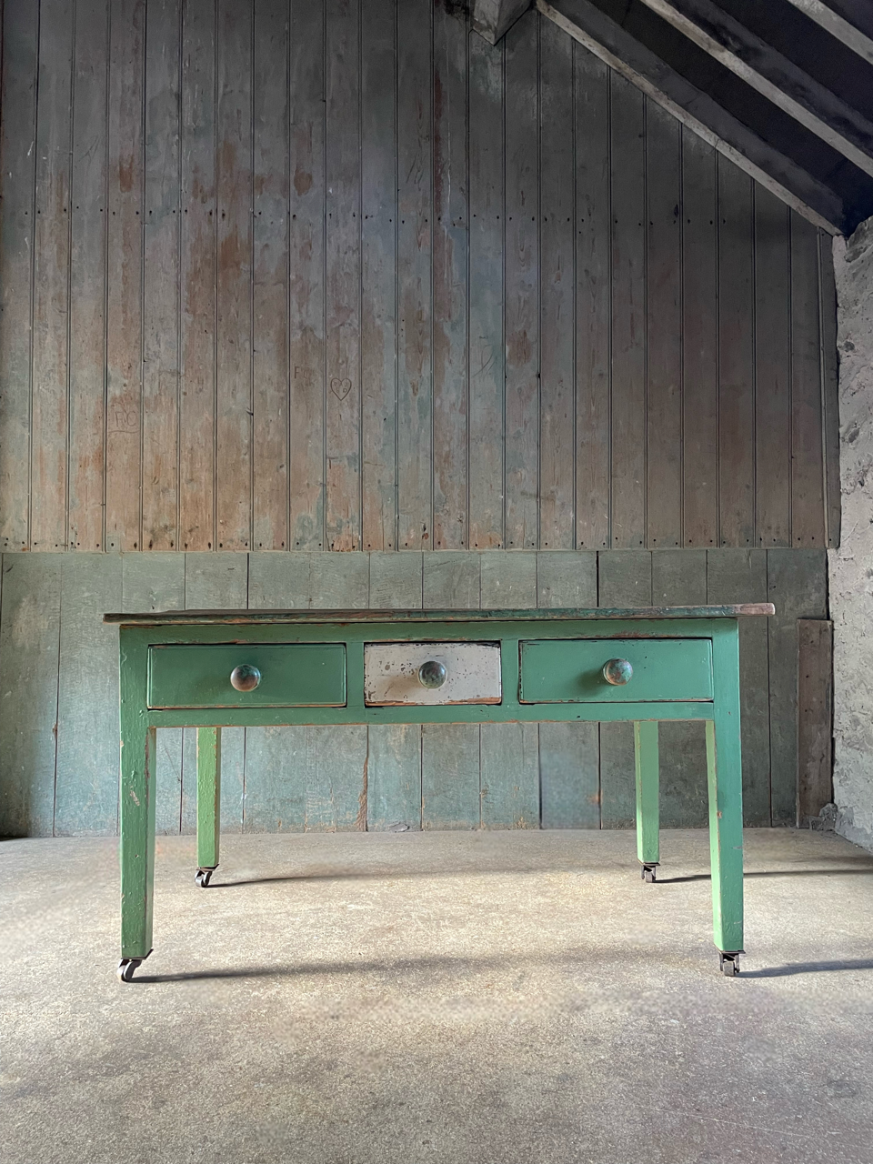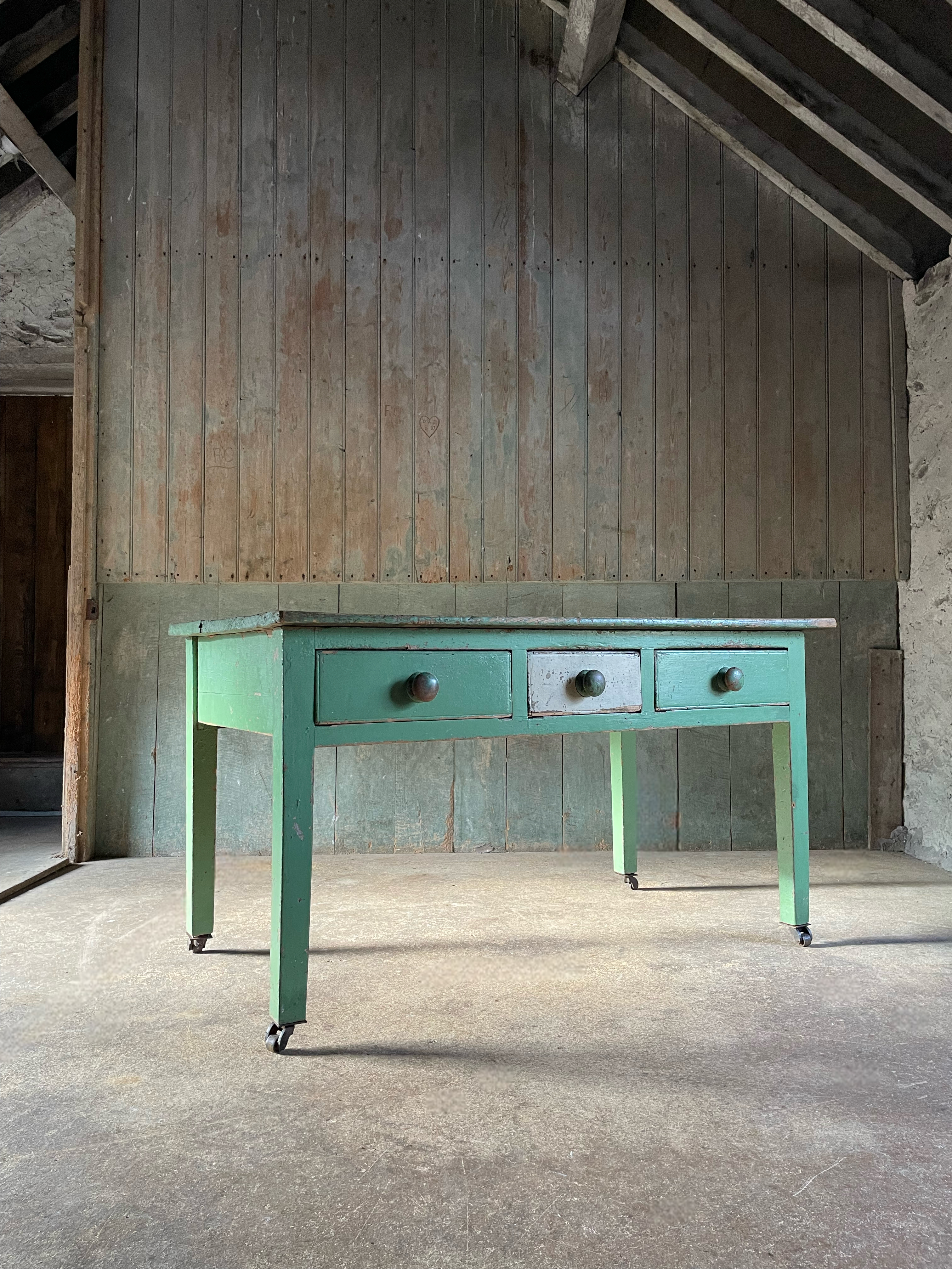 A C19th pine prep or baker’s table with three drawers, scrubbed top and painted base, raised on castors.
