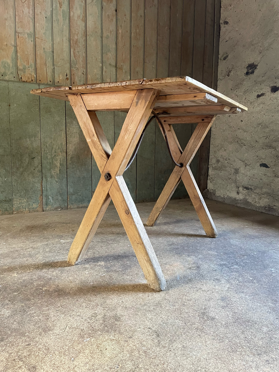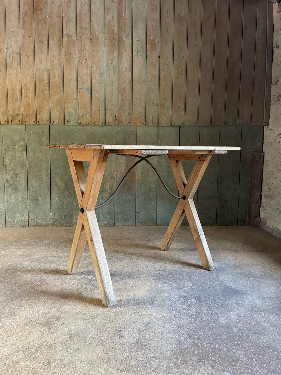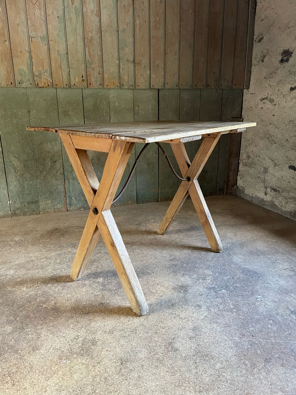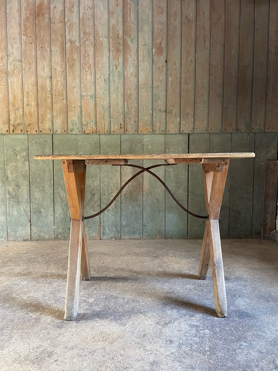 A C19th rustic pine x frame tavern table with unusual decorative iron supports.