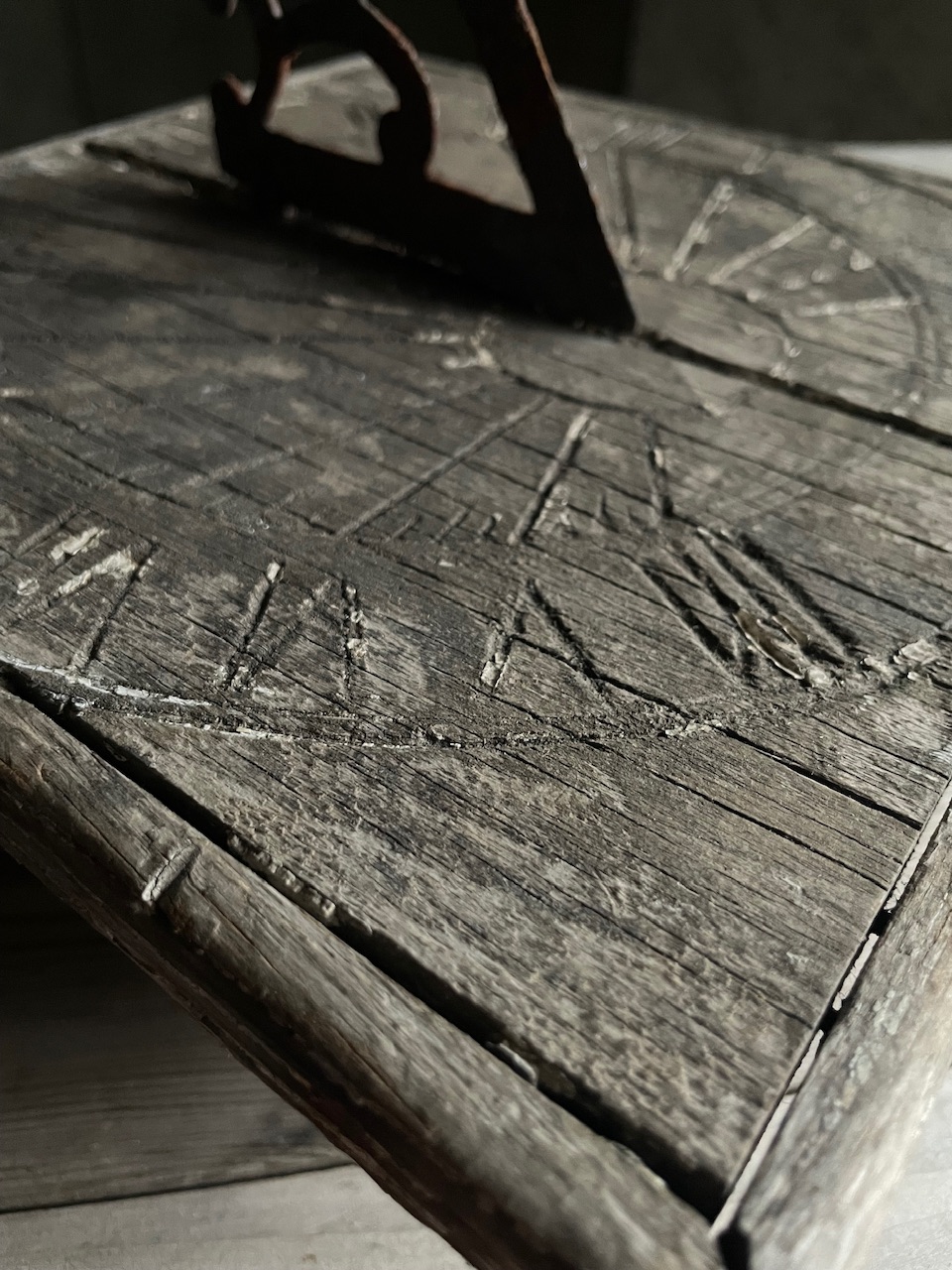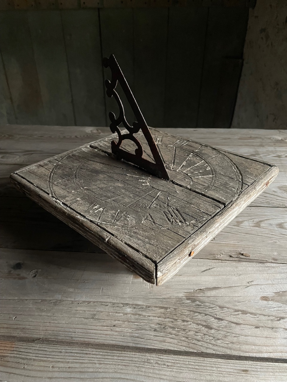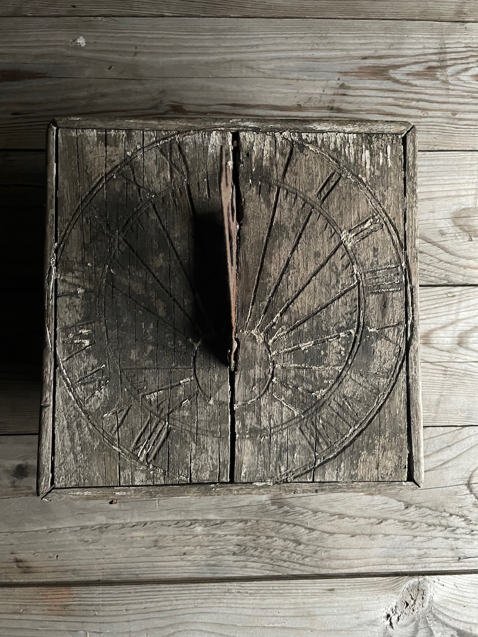 An unusual and very decorative carved wooden sundial with weathered surface and remnants of old white paint.