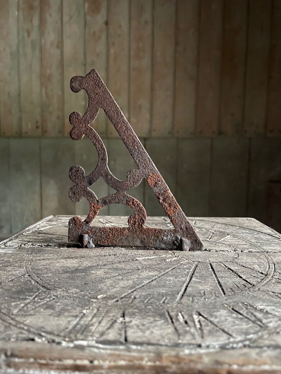Iron gnomon, the whole raised on ball feet.