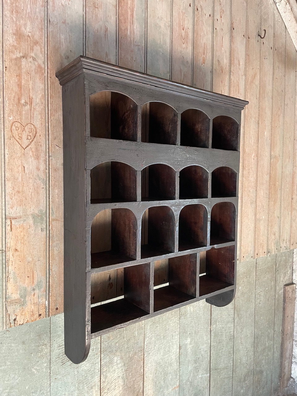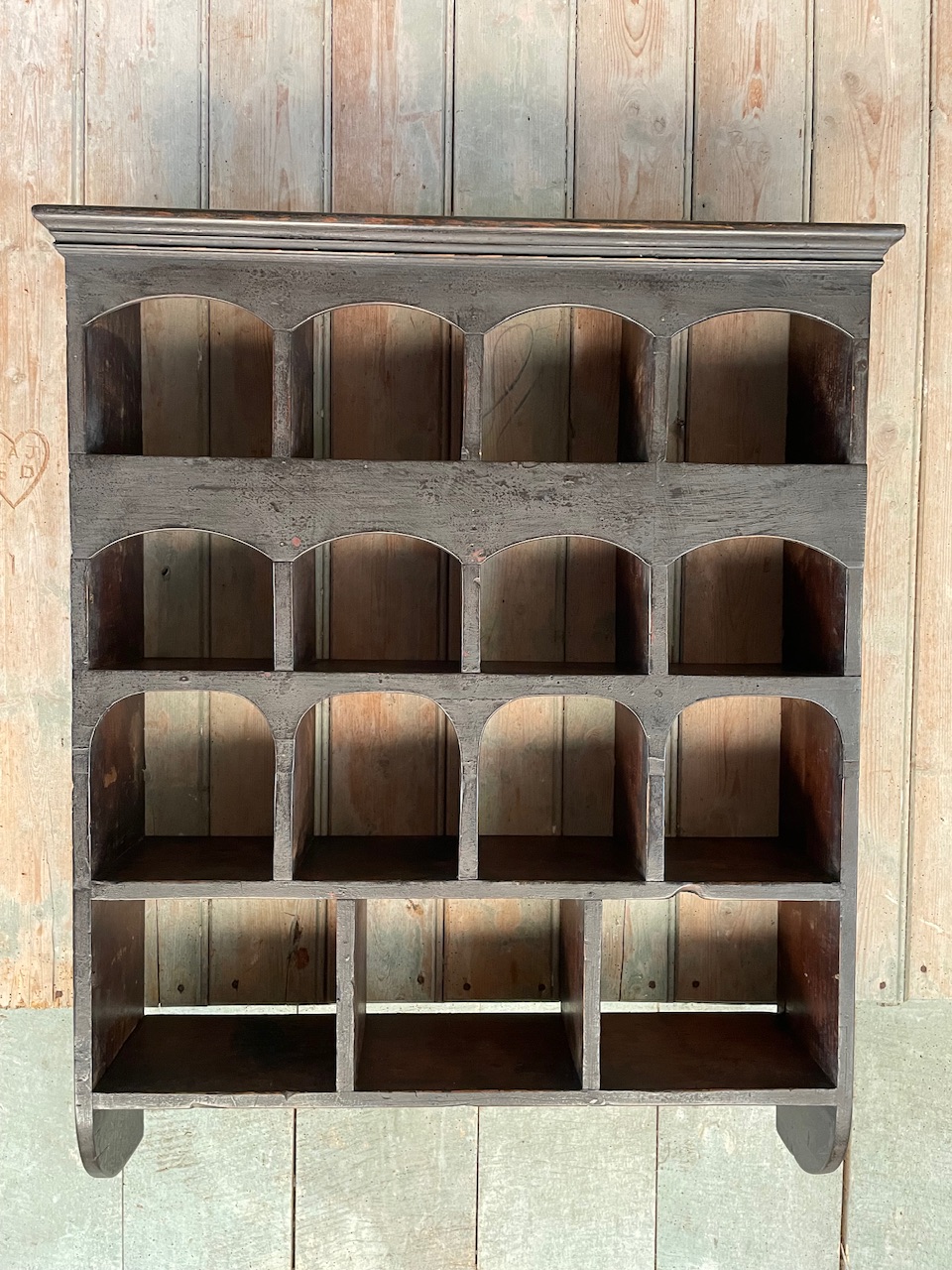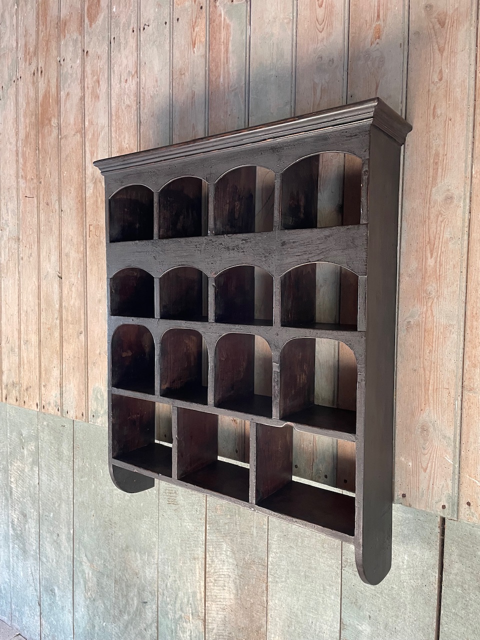 An early C19th, pine, wall mounted pigeon hole rack in its original painted finish.