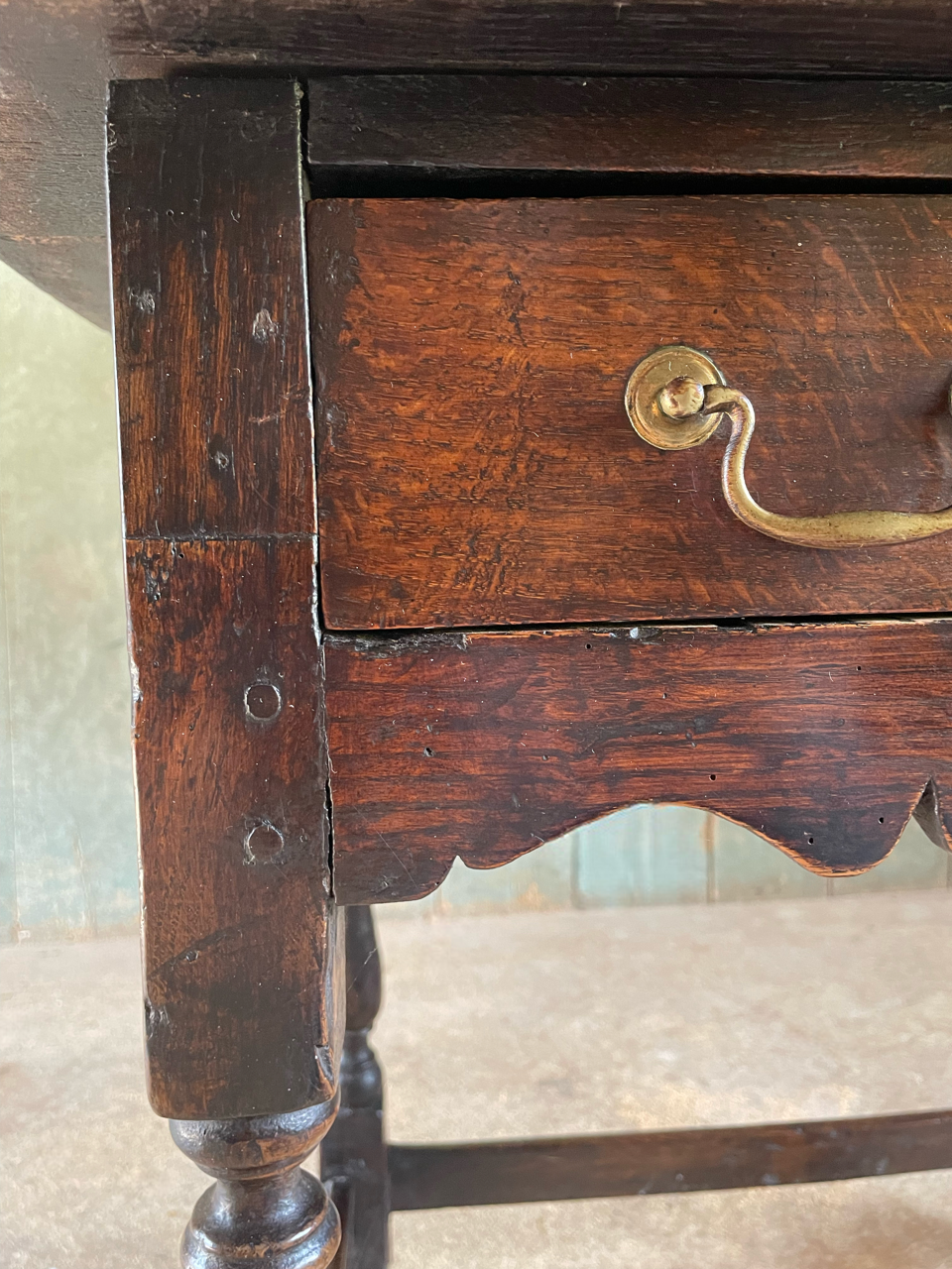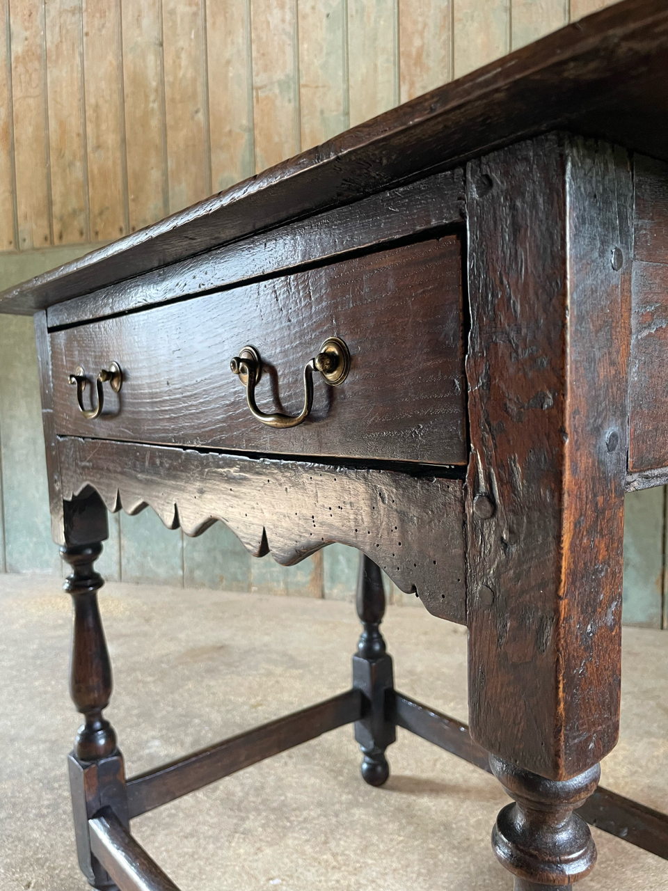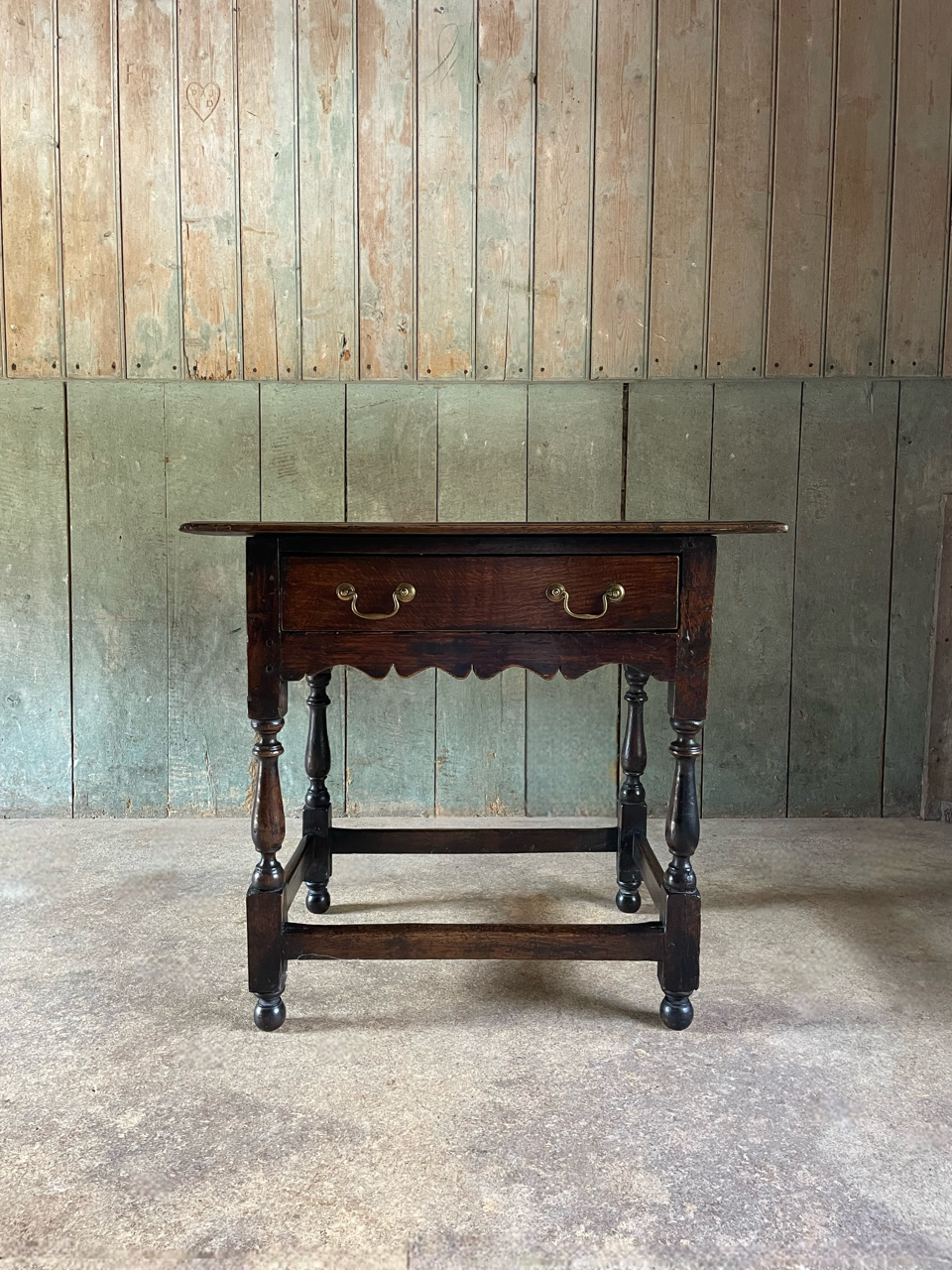 Elaborately shaped apron below a single drawer, raised on turned legs joined by a low stretcher.