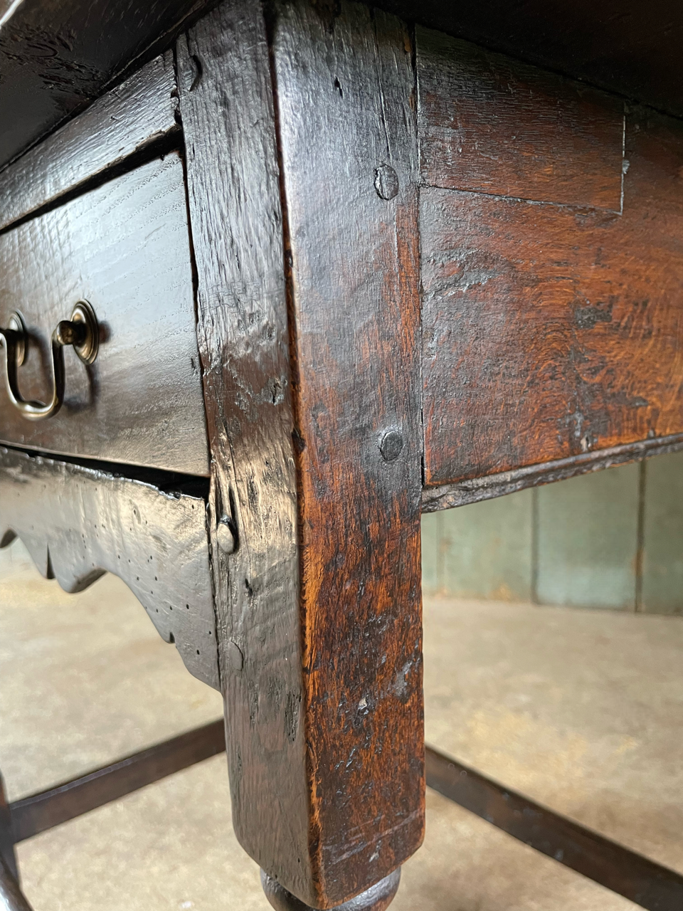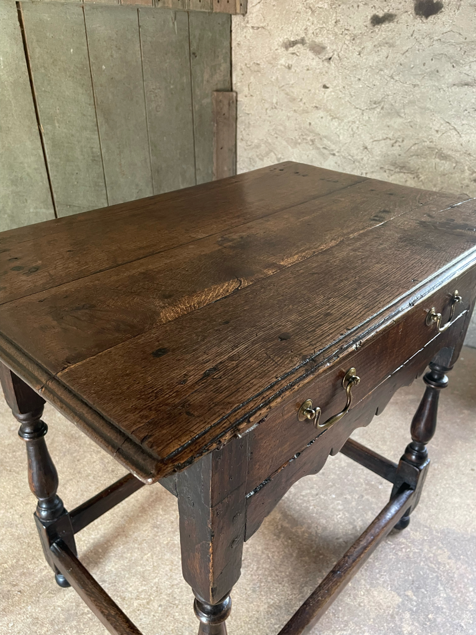 The whole a lovely, dark, nutty, colour. Wear commensurate with age, with old running repairs.