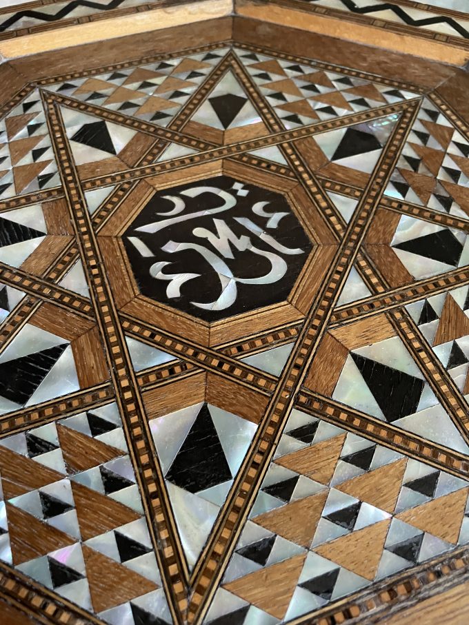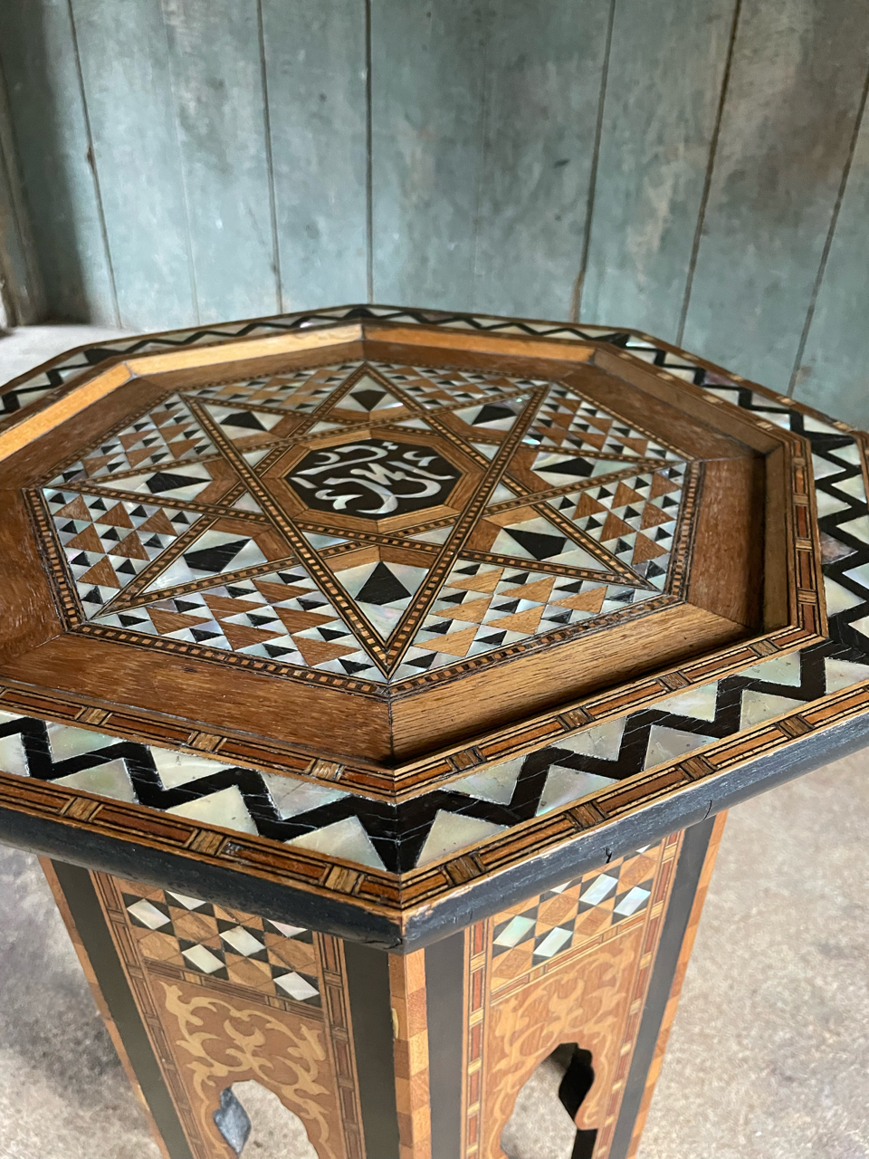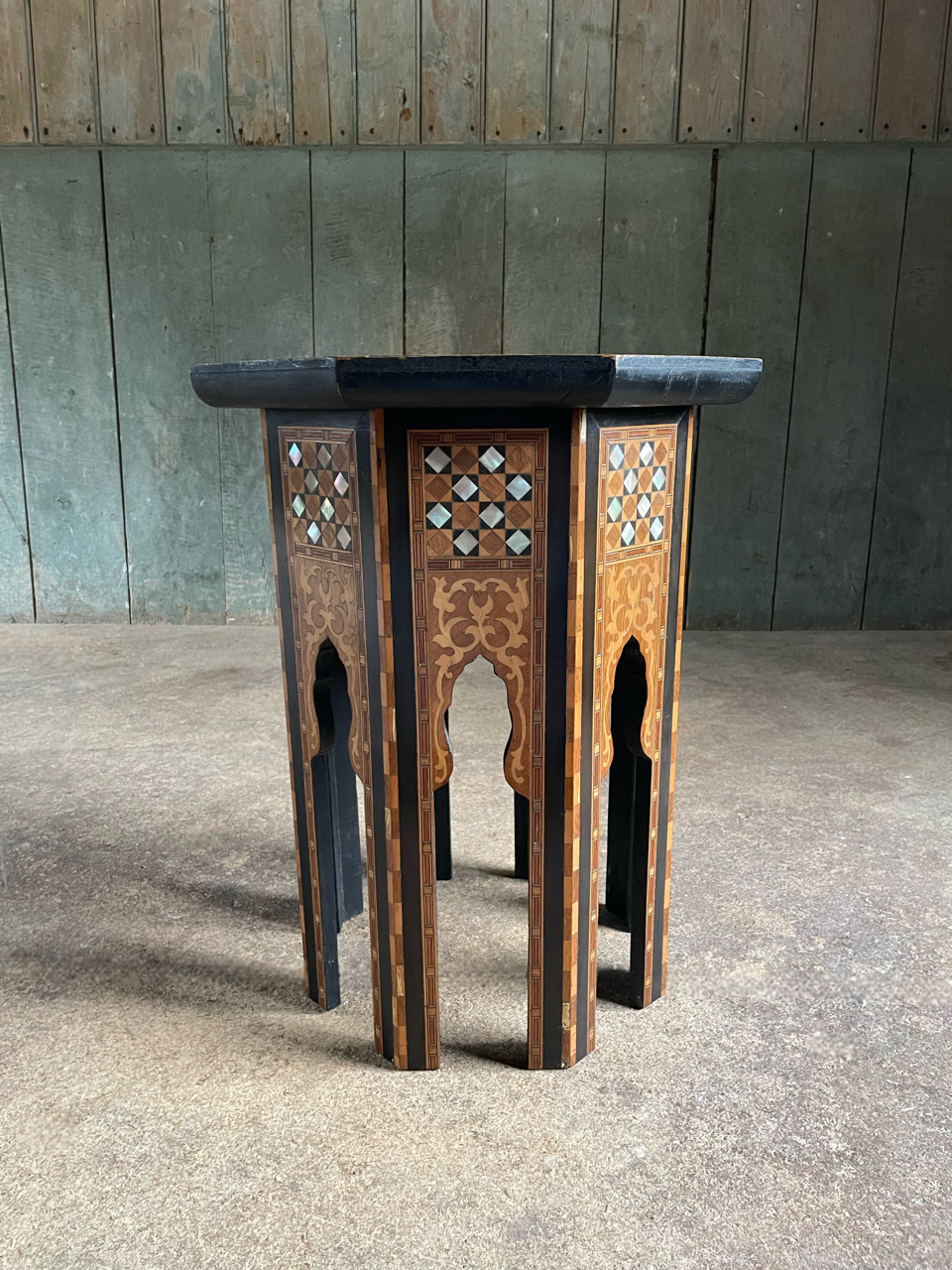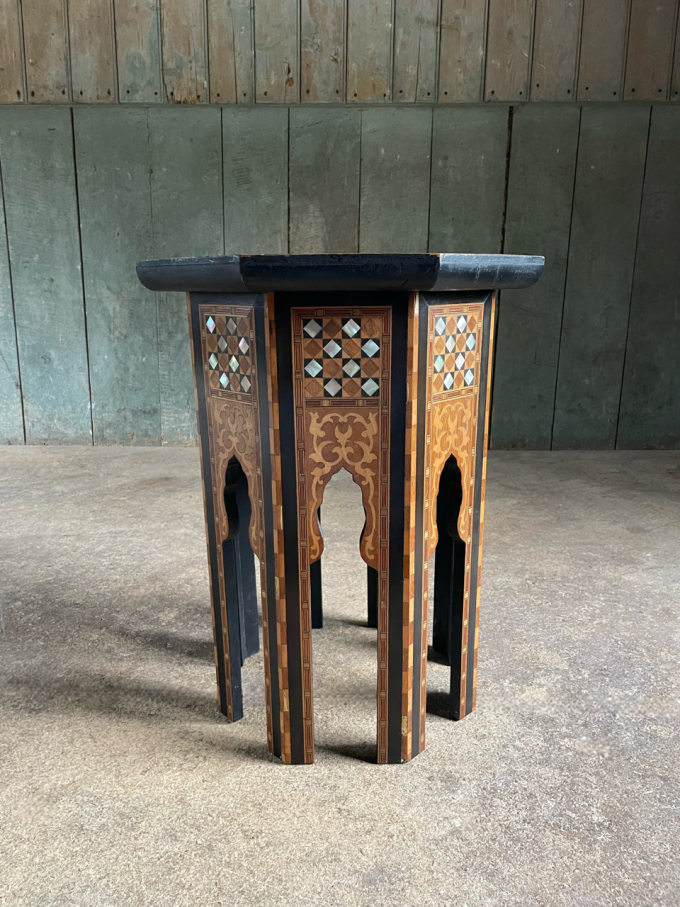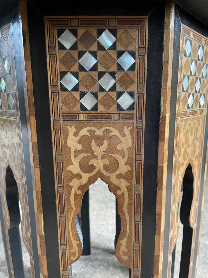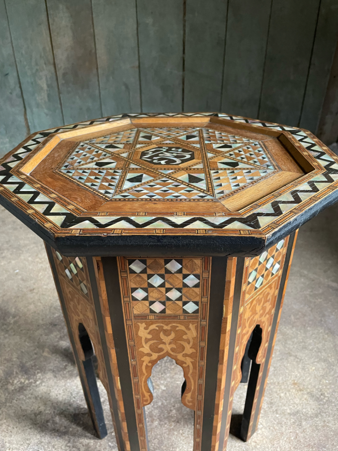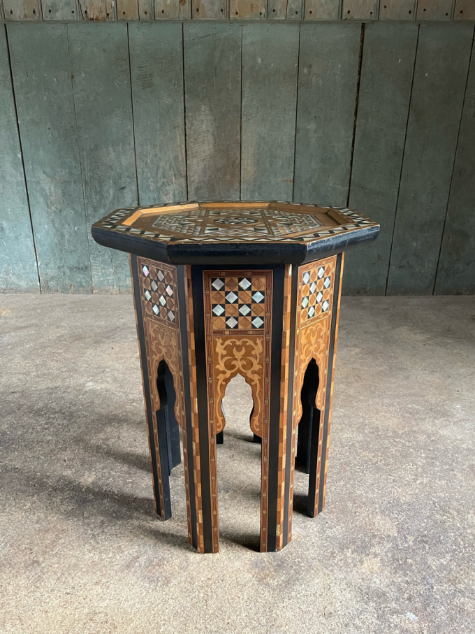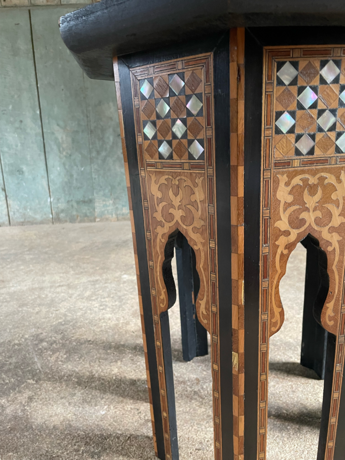 An attractive, fine quality, Syrian Moorish occasional table, of typical, octagonal form, profusely decorated with various timber and mother of pearl inlays.