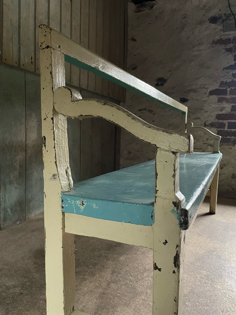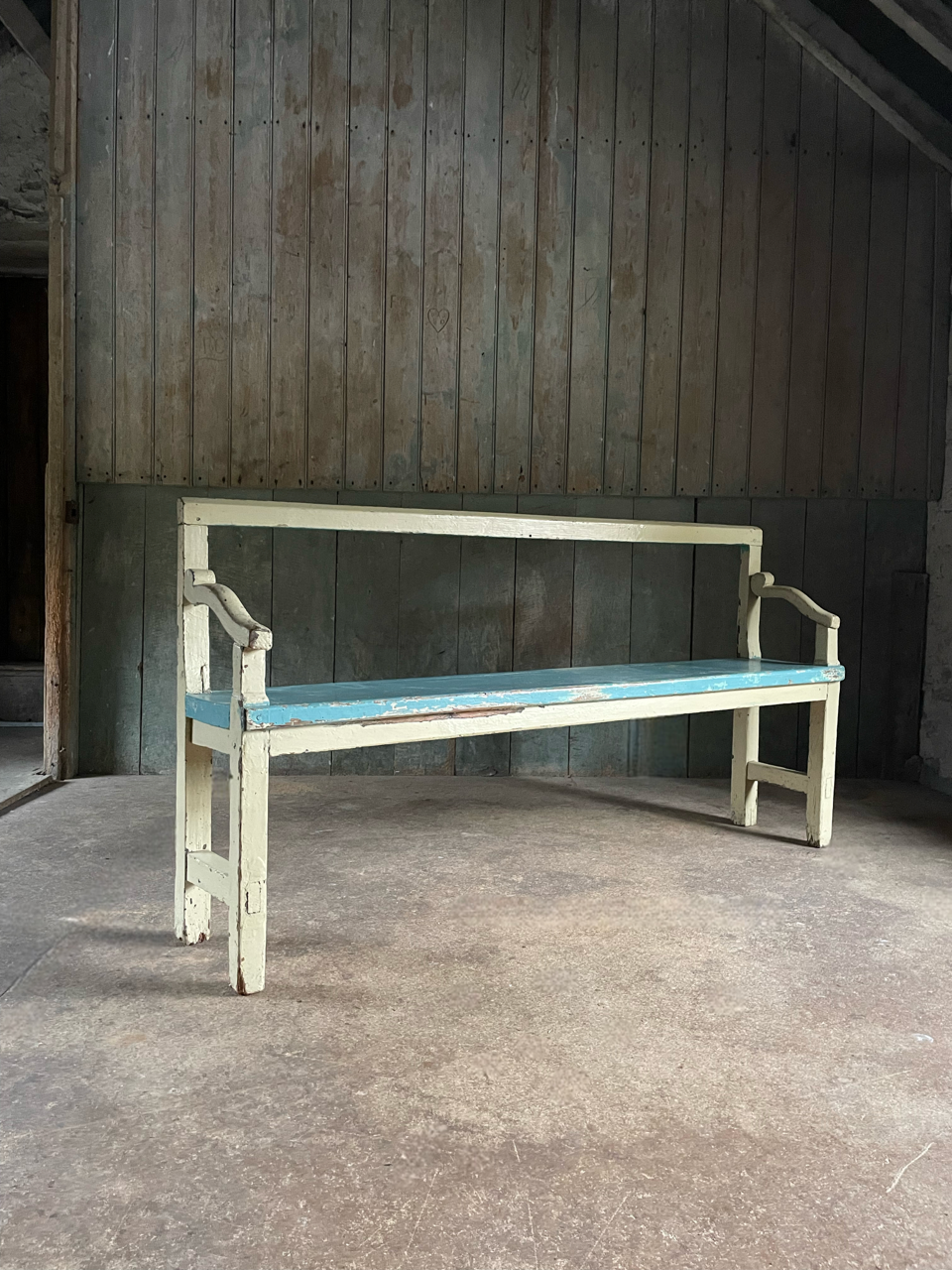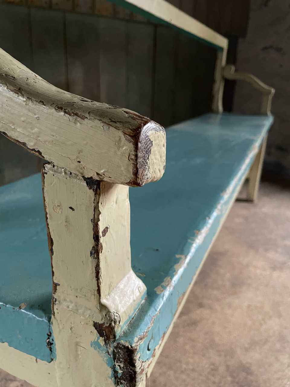 Measurements: H: 34” (86”.5cm); H to seat: 19.25” (49cm); W: 65.75” (167cm);  D: 13” (33cm).