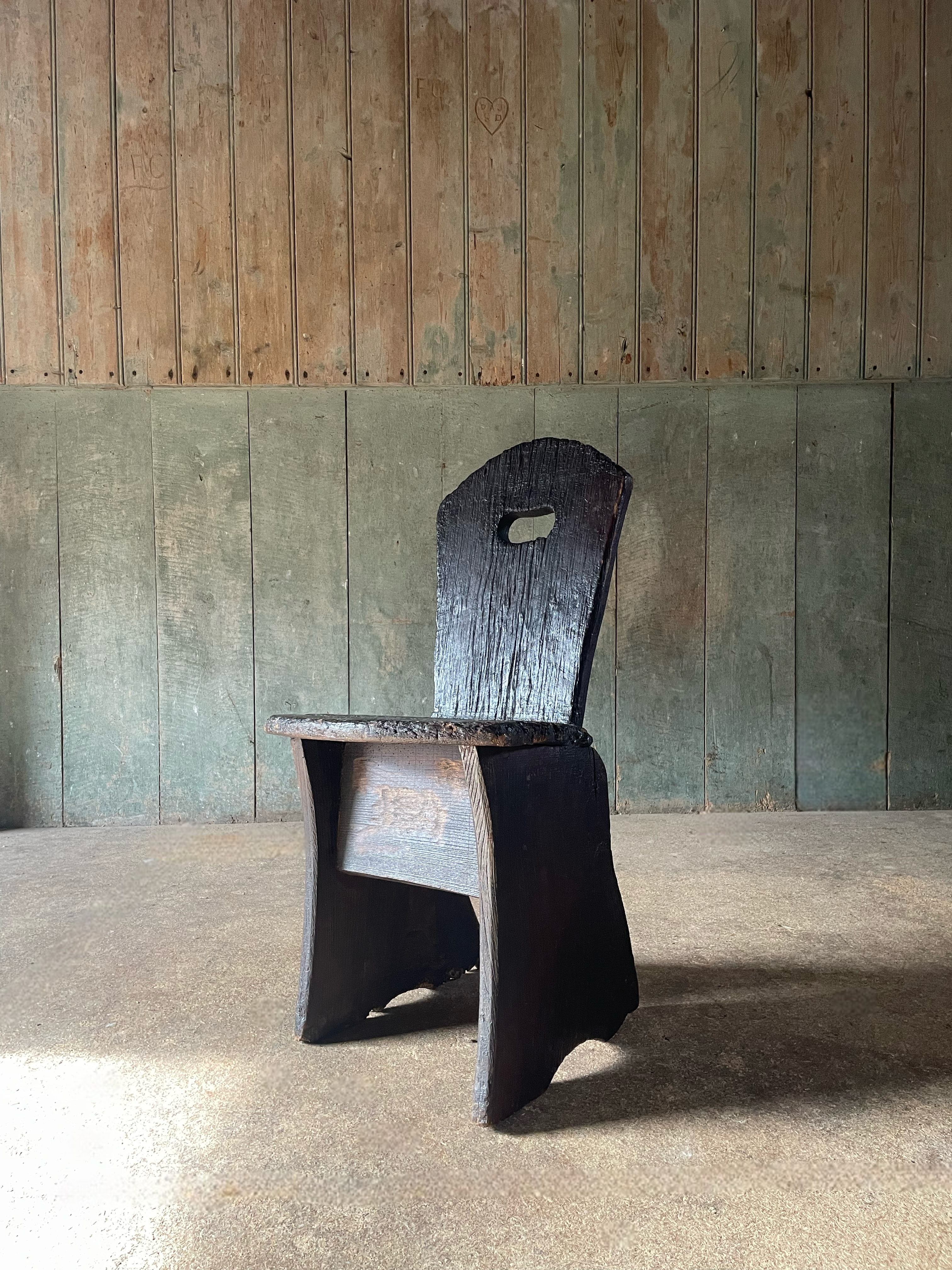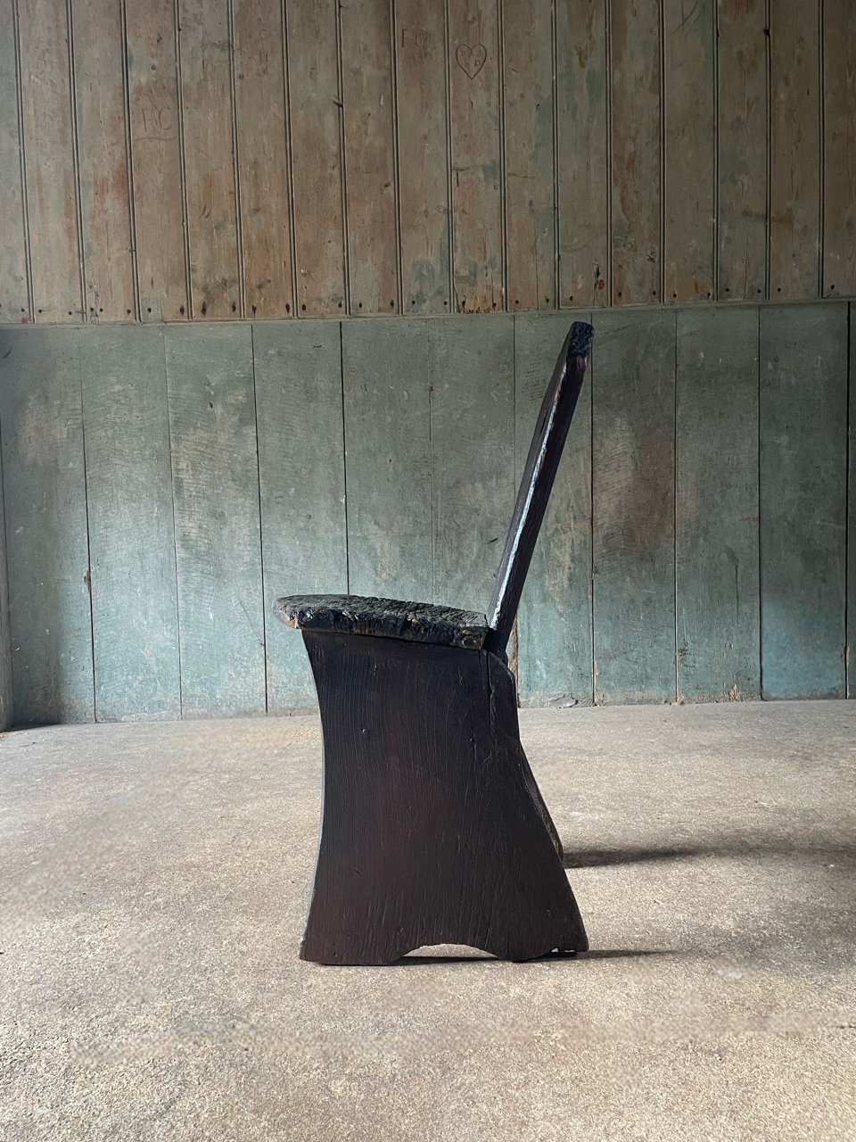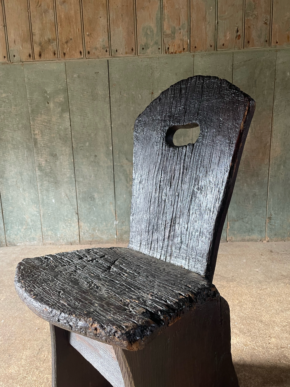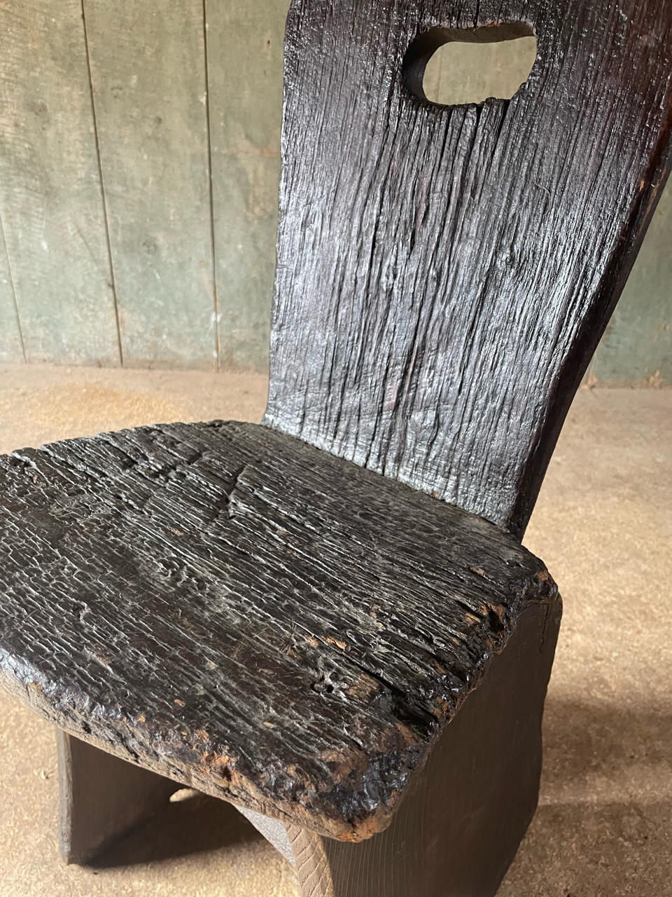 Though the wear on this chair suggests great age, I suspect it rather reflects heavy use in a work environment, akin to similarly characterful Welsh slate splitter’s chairs of the late C19th.