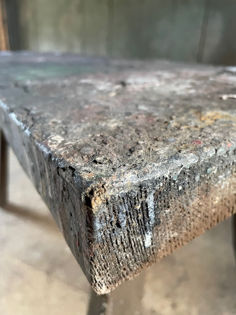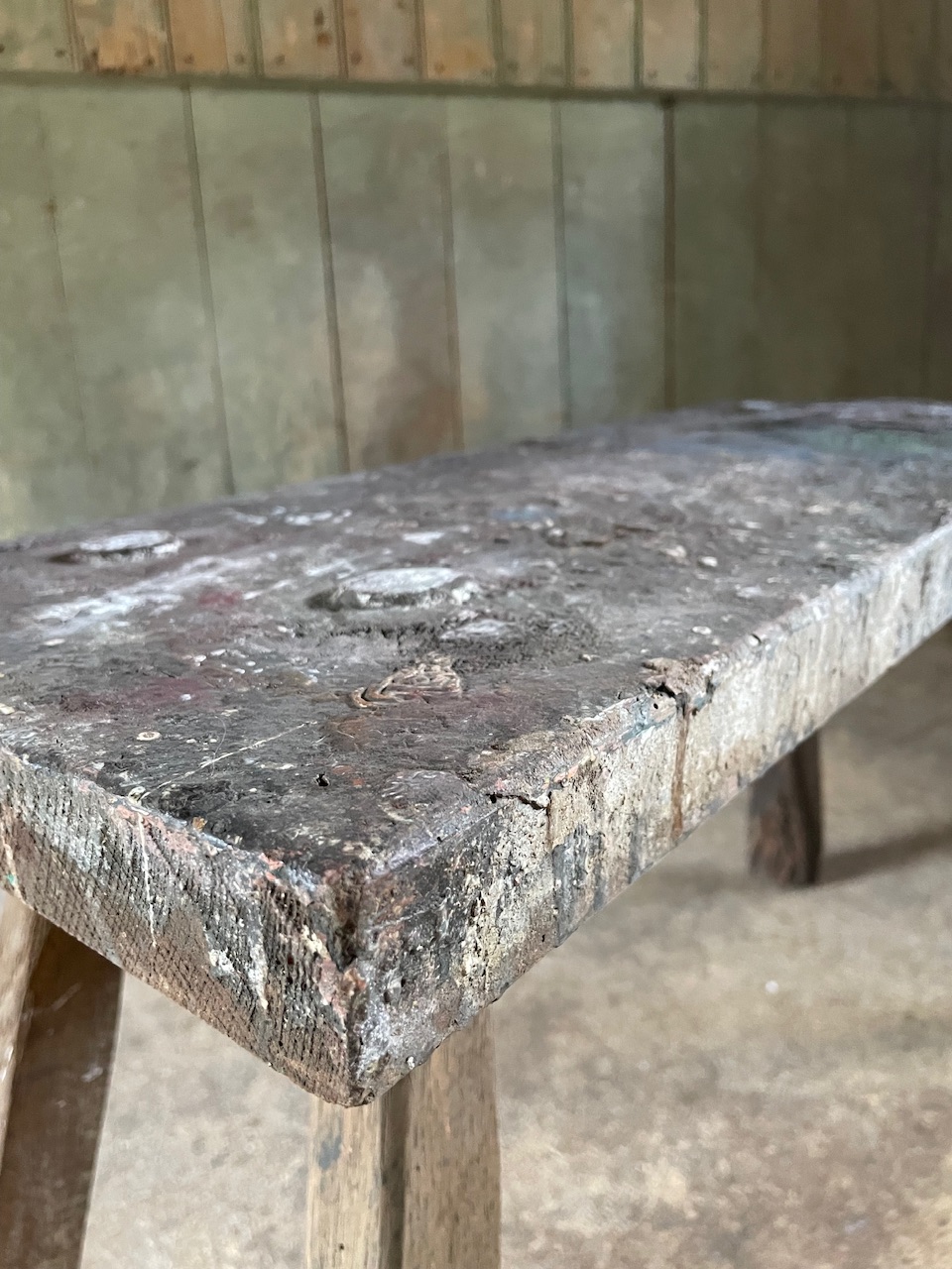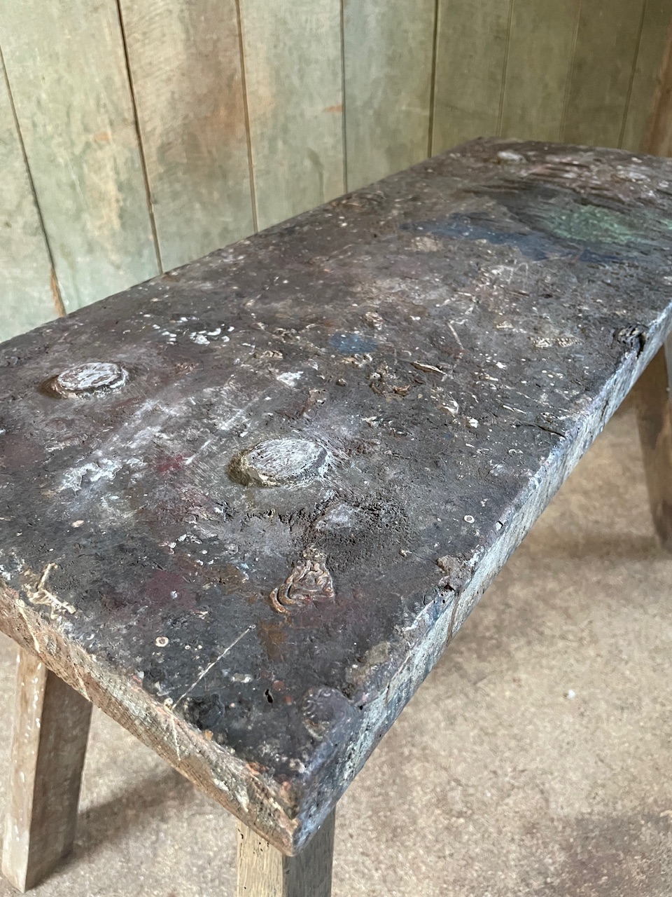 A primitive C19th oak bench used in an artist’s studio to hold their paints and caked in various pigments.