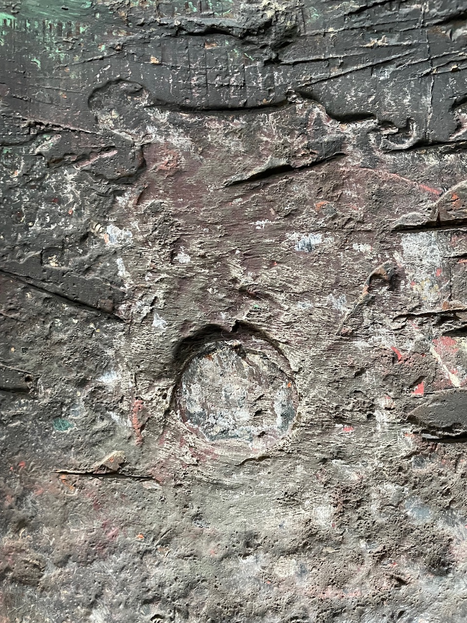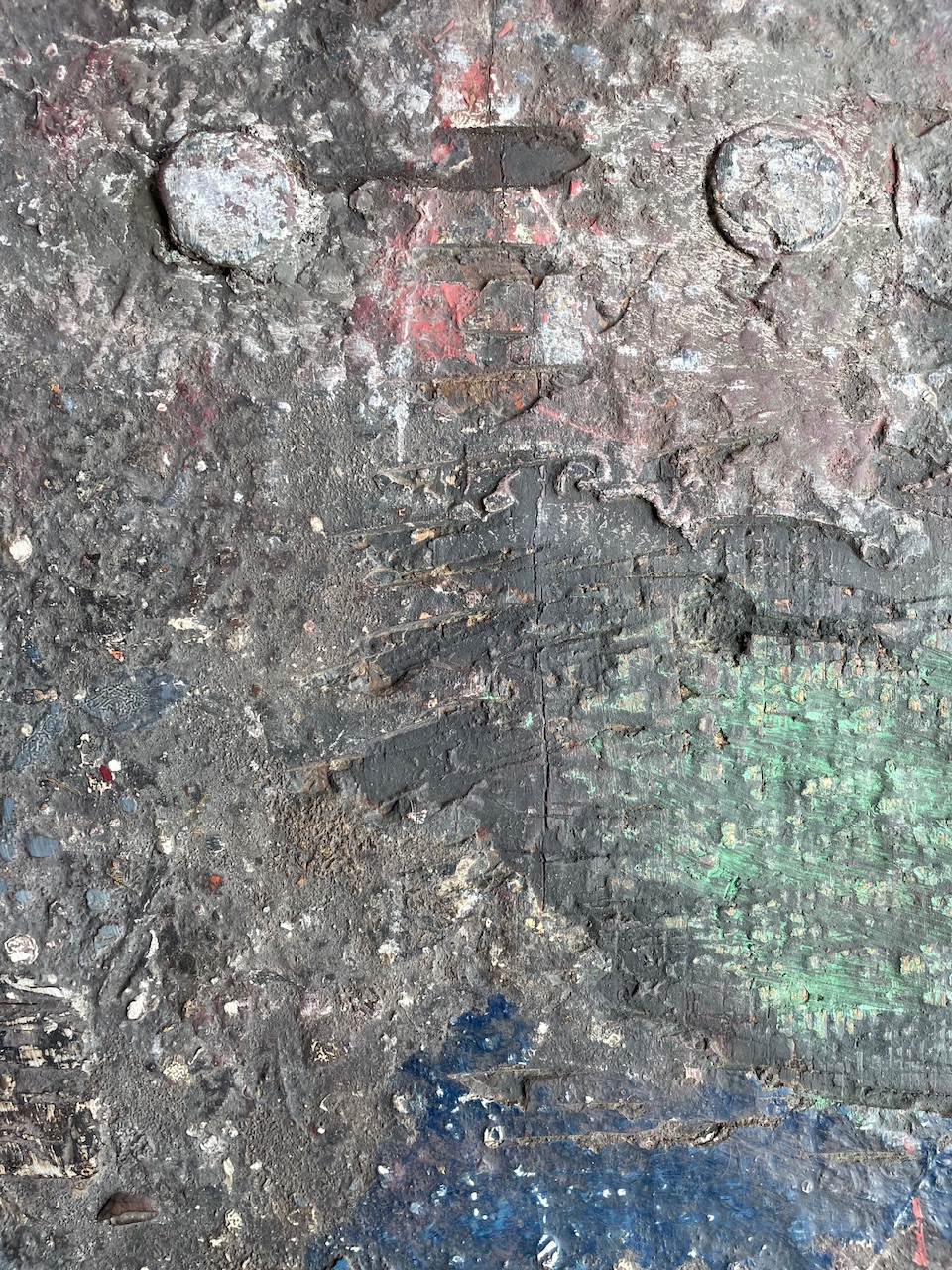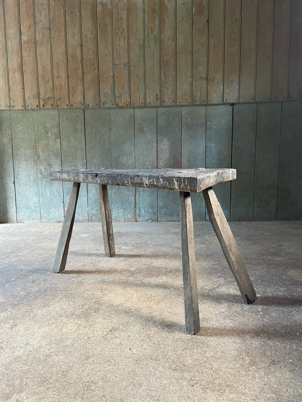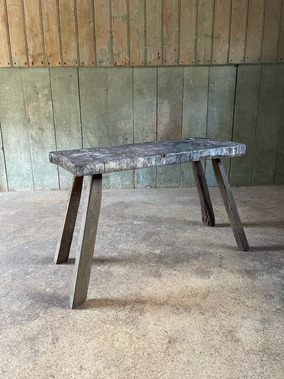 A primitive C19th oak bench used in an artist’s studio to hold their paints and caked in various pigments.