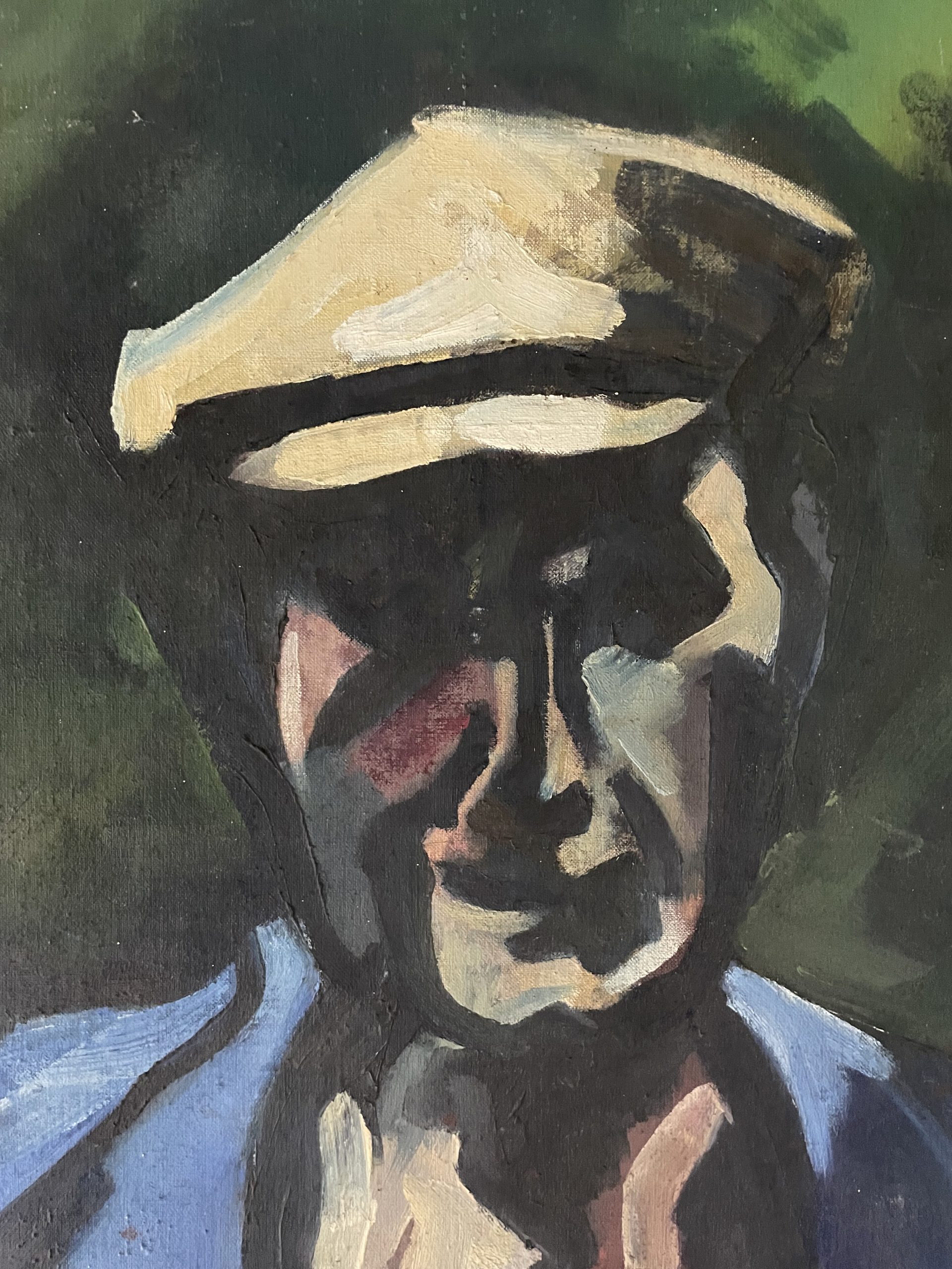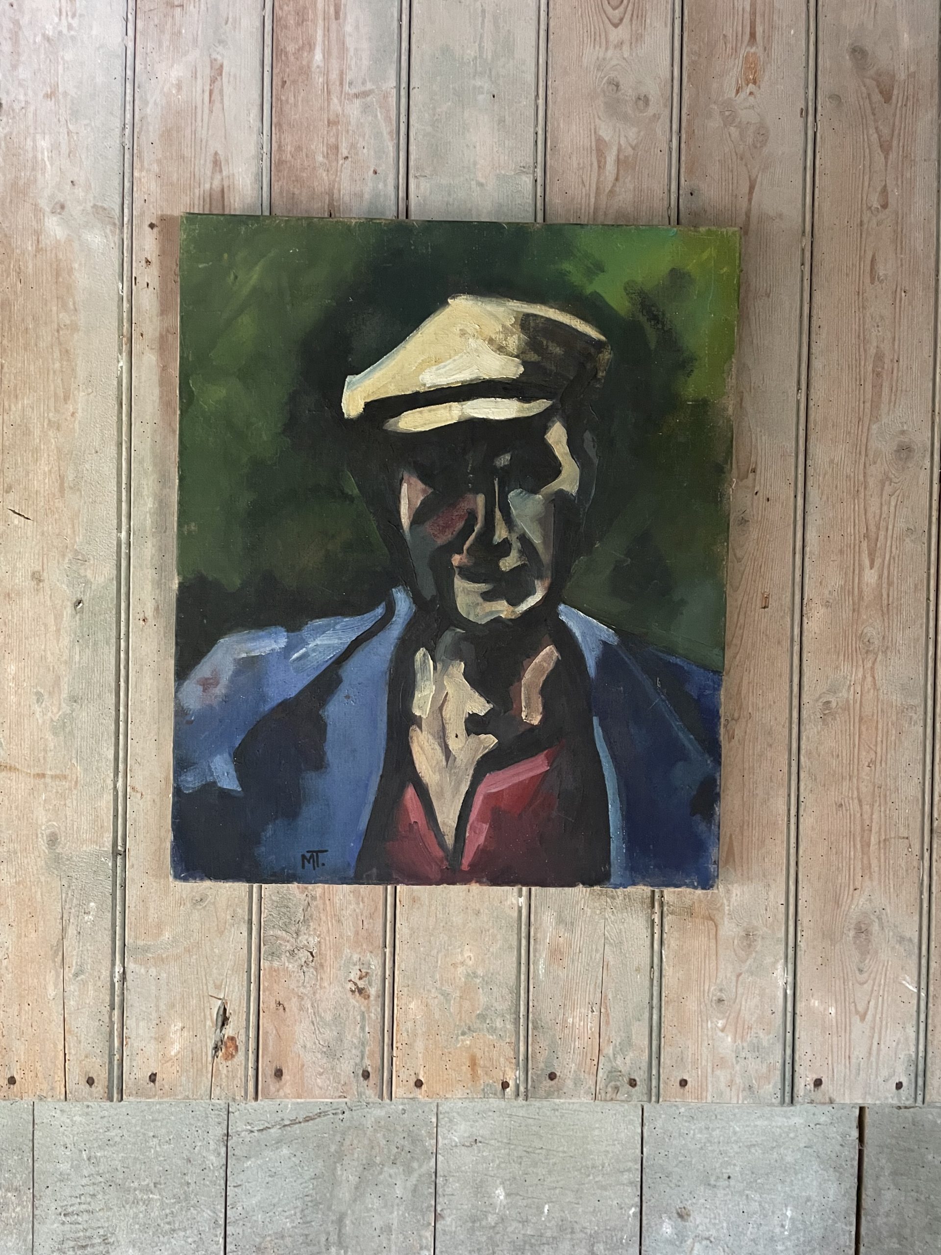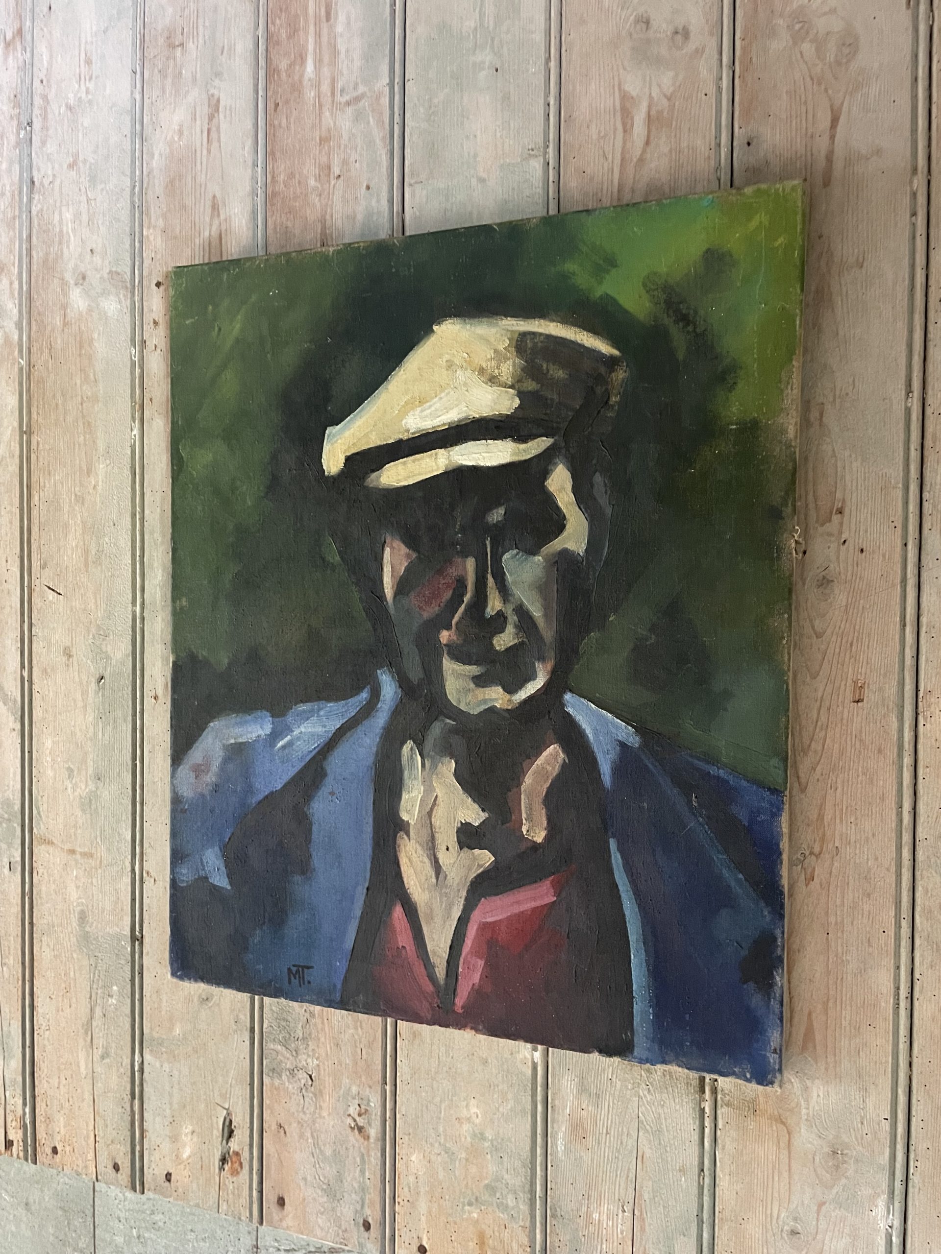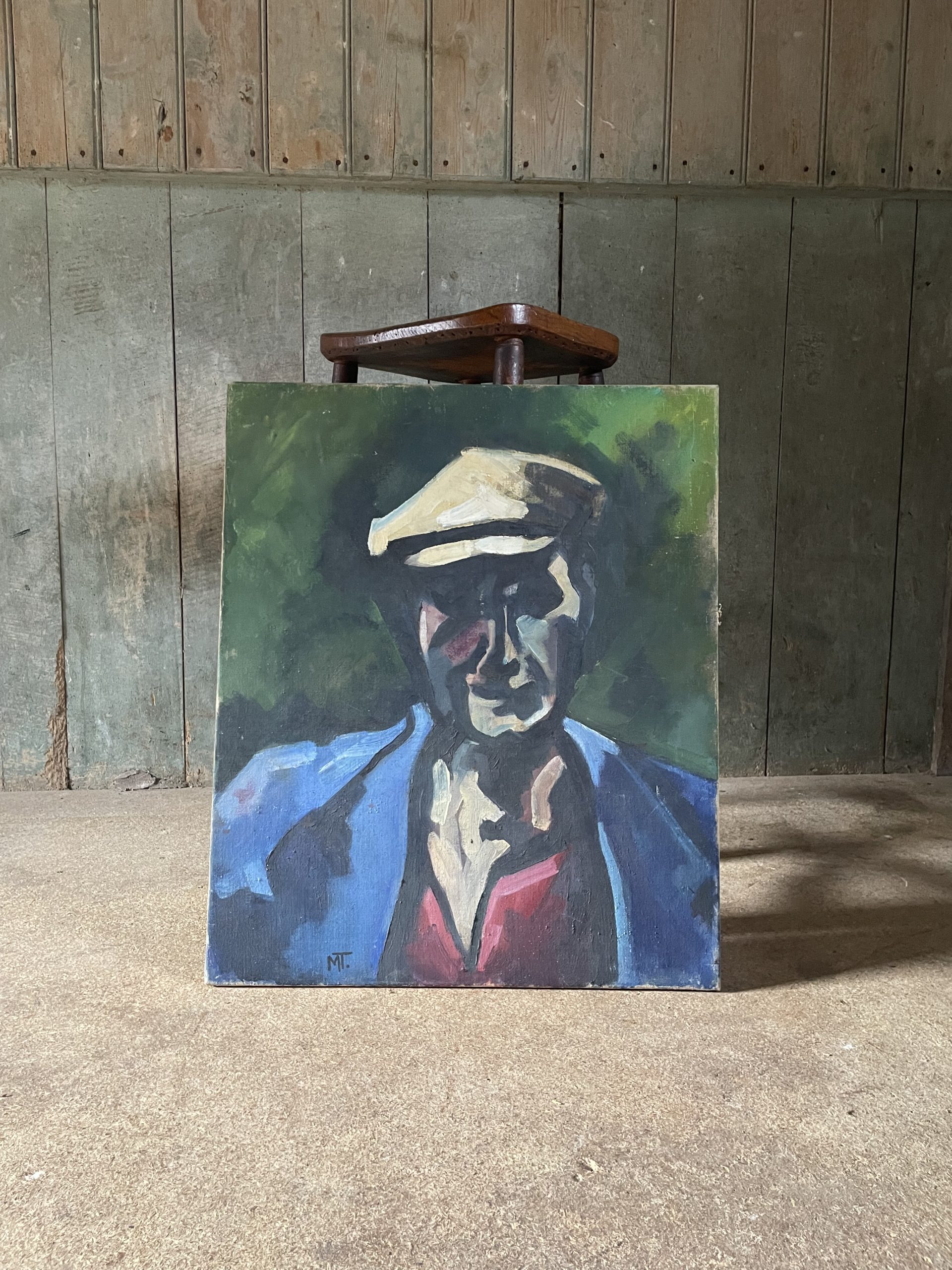 A striking, mid C20th, oil on canvas study of a man in a cloth cap and worker’s jacket.