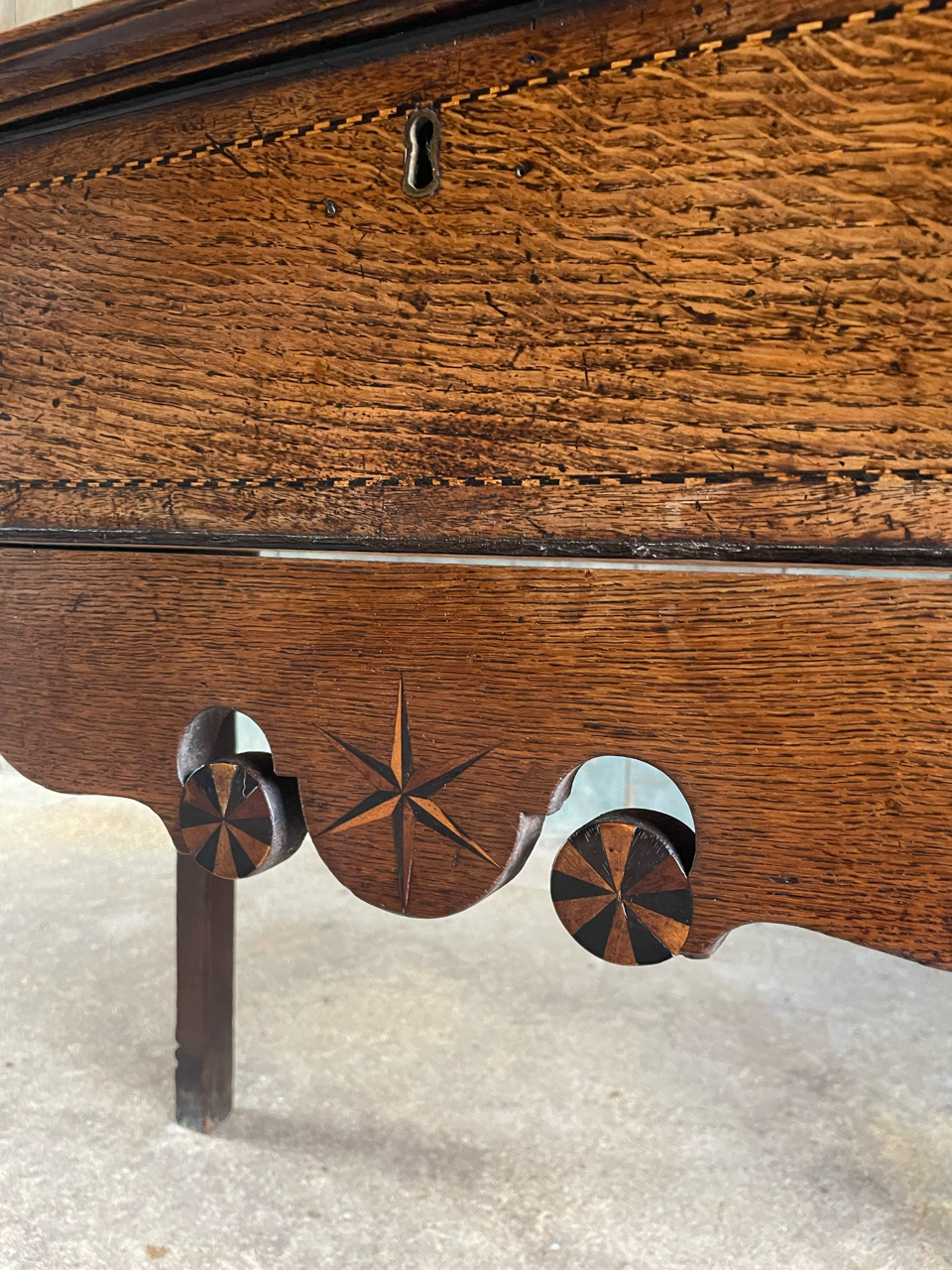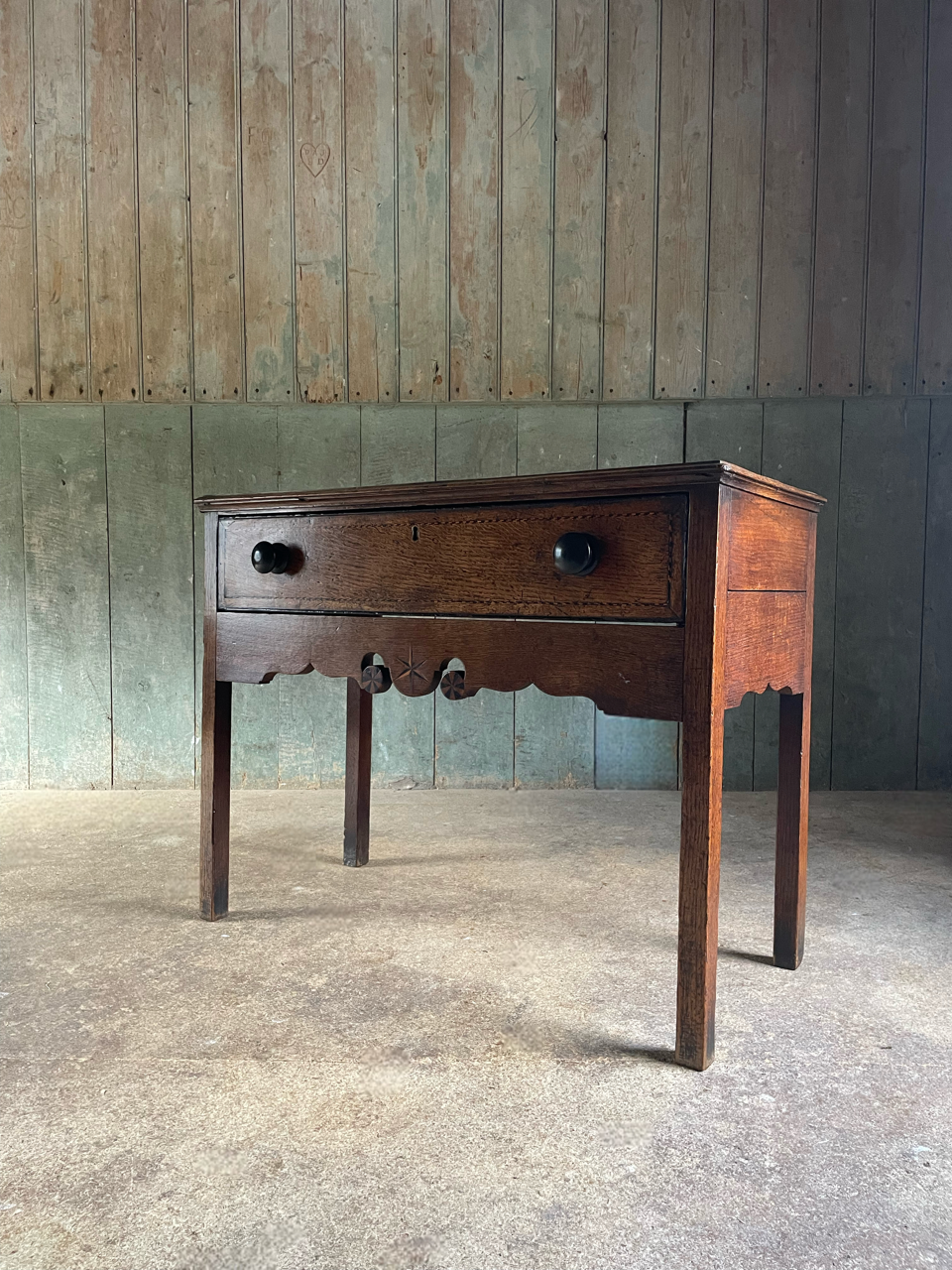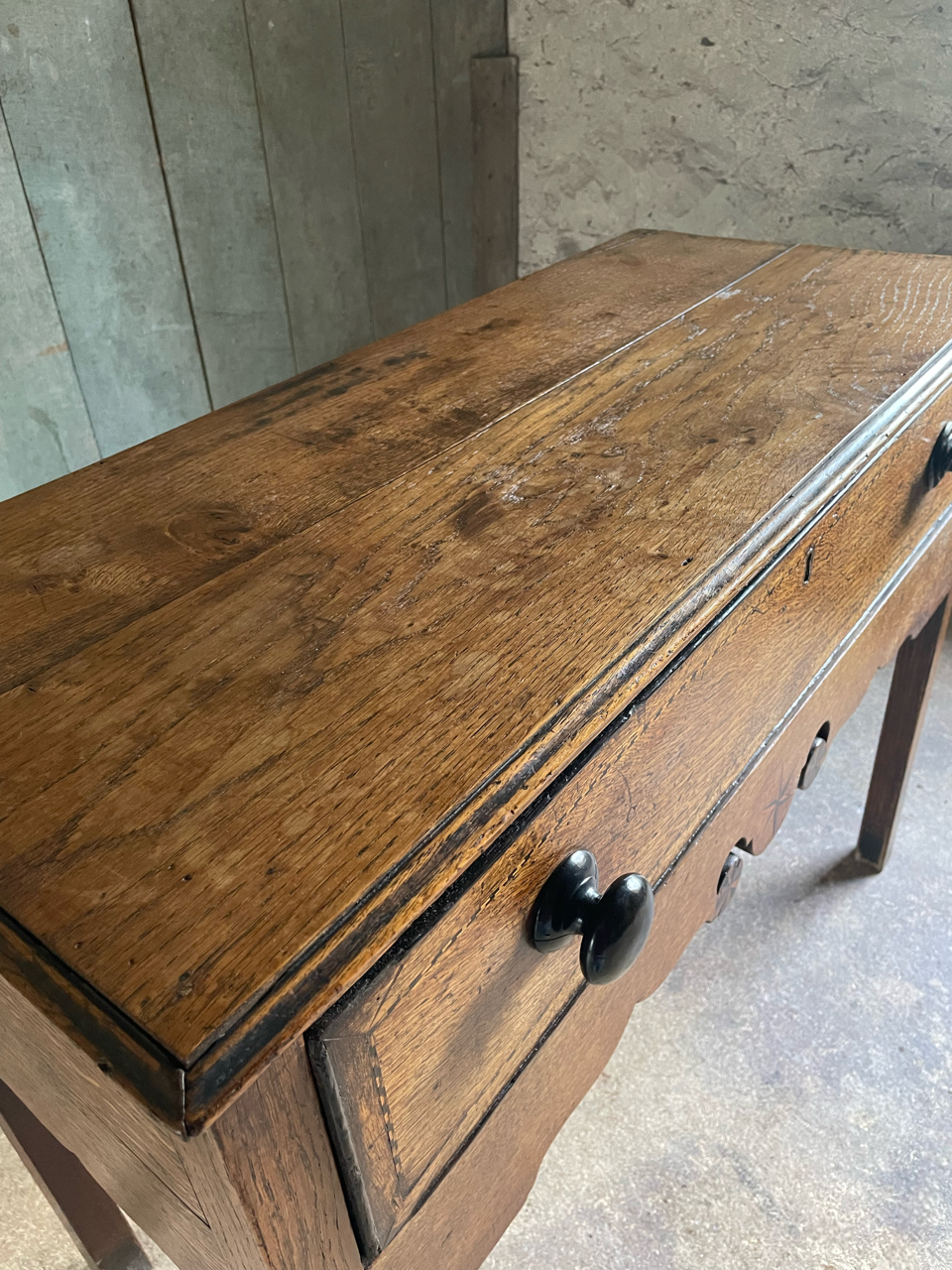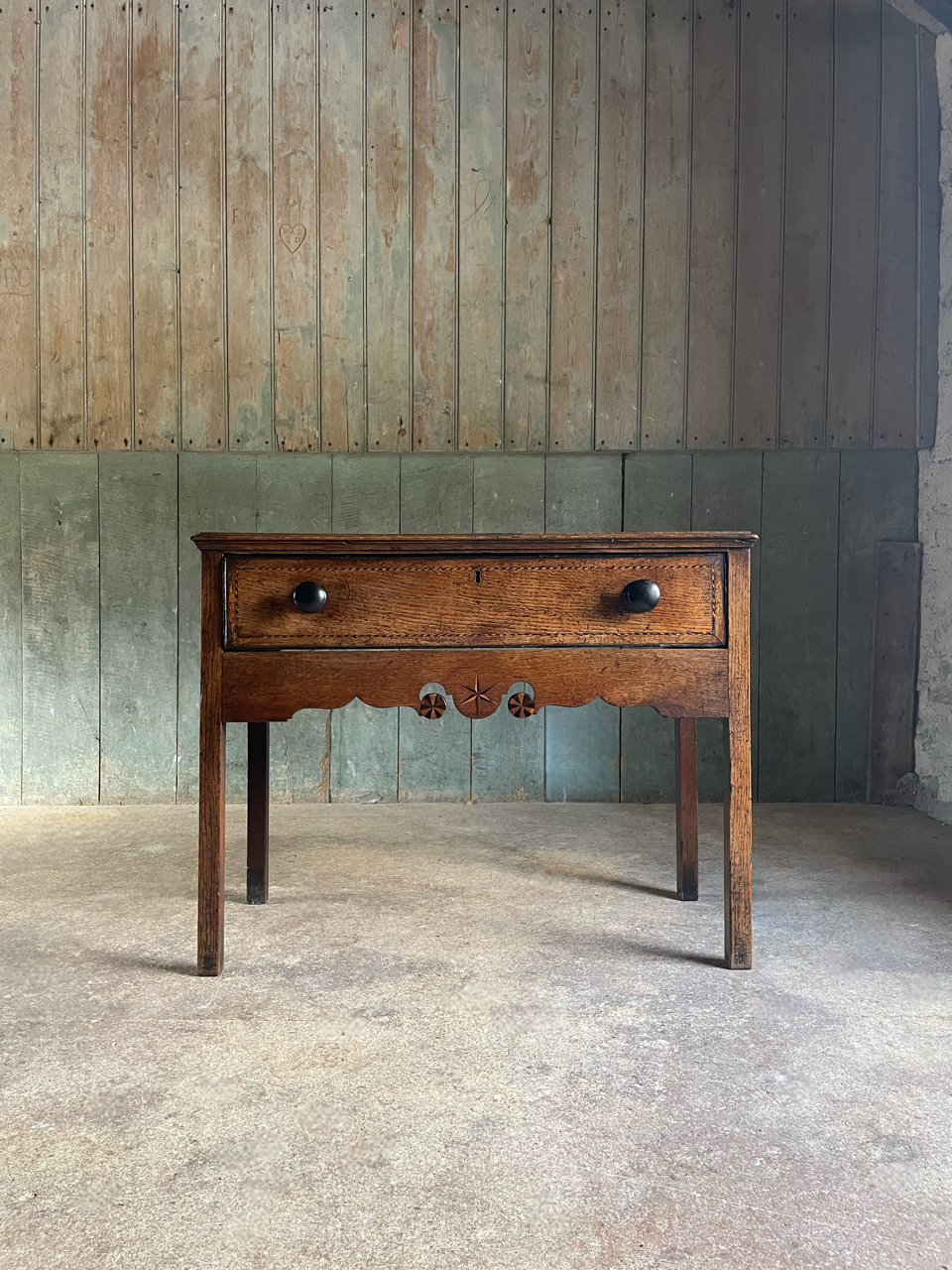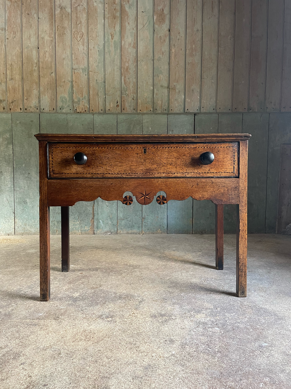 A very attractive late C18th Welsh oak side table with shaped apron and beautiful, delicate inlay in bog oak and holly.