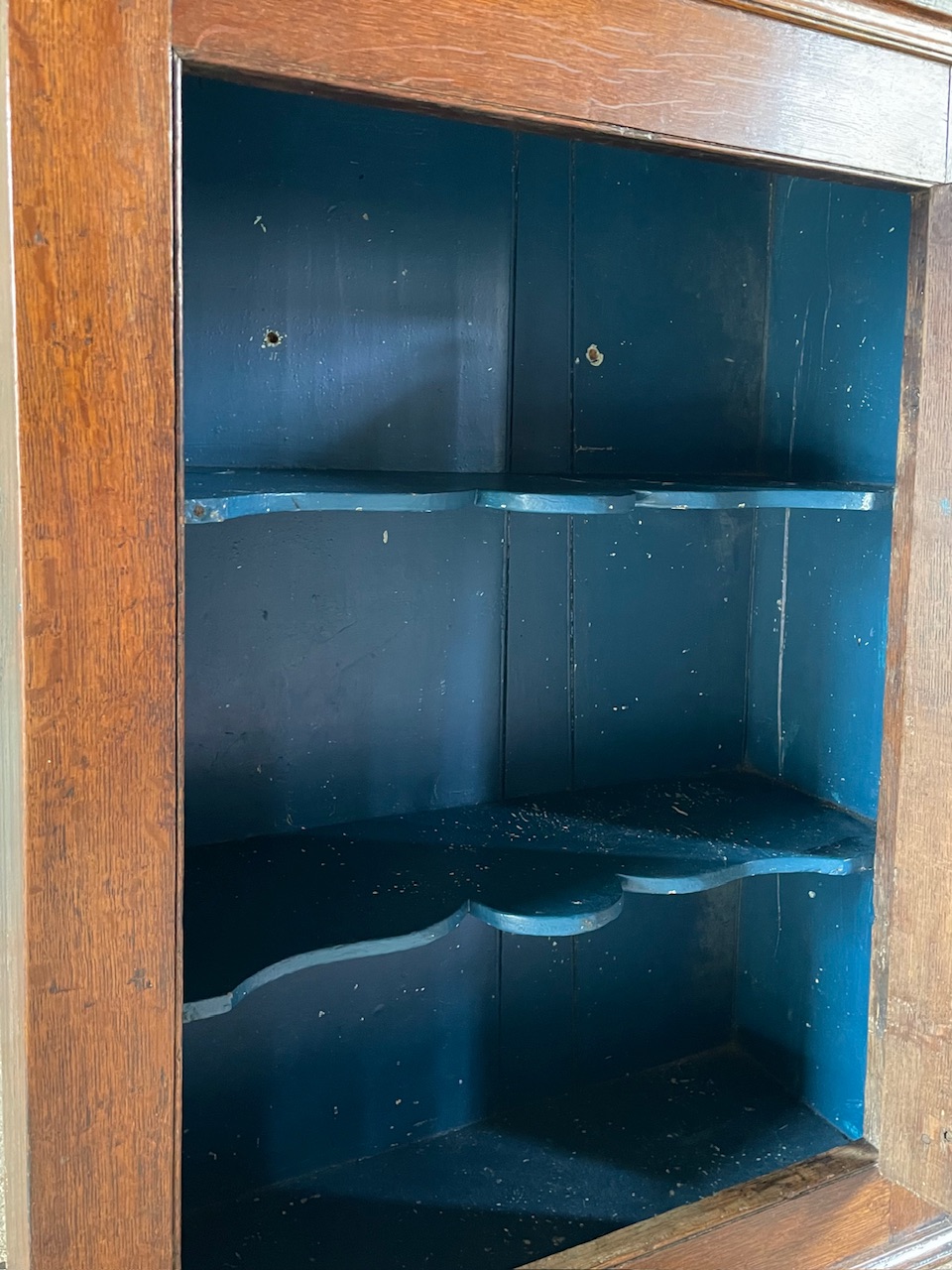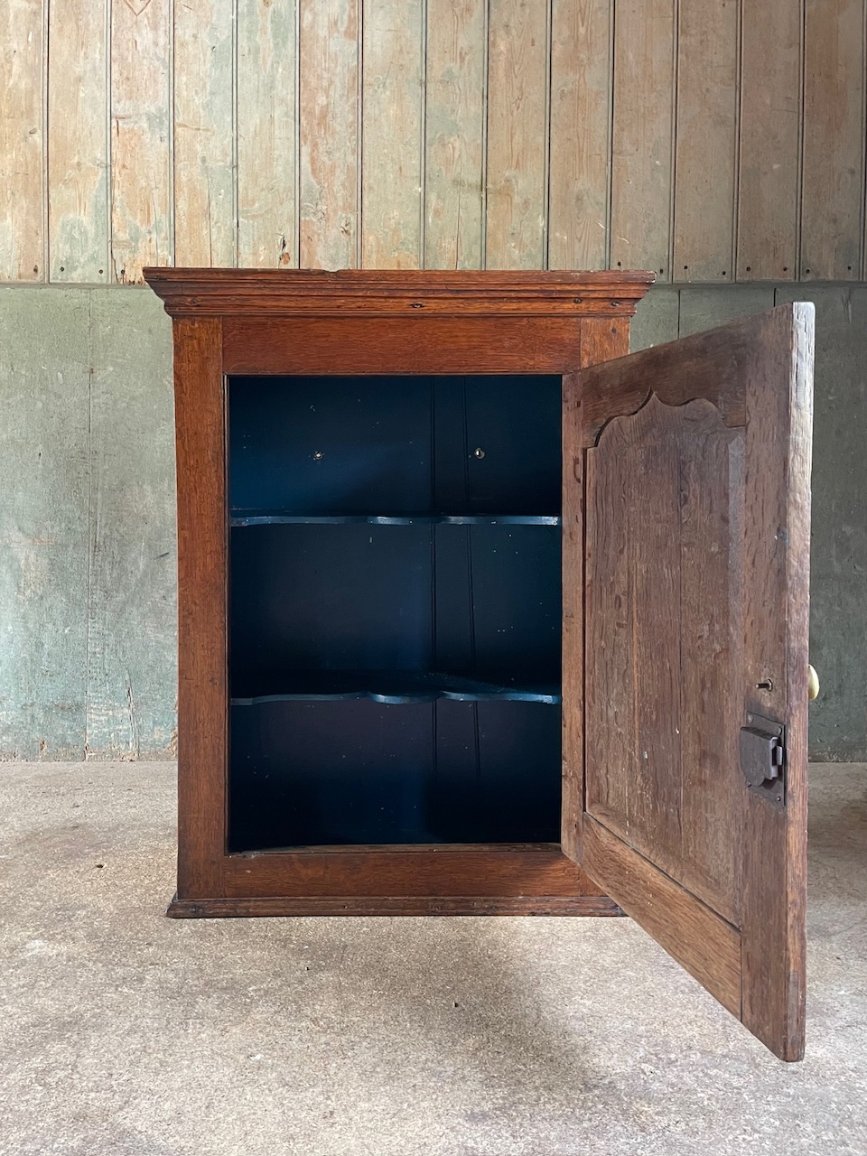 Lovely rich colour, original working key, Interior with two Cupid’s bow shaped shelves in old blue paint.