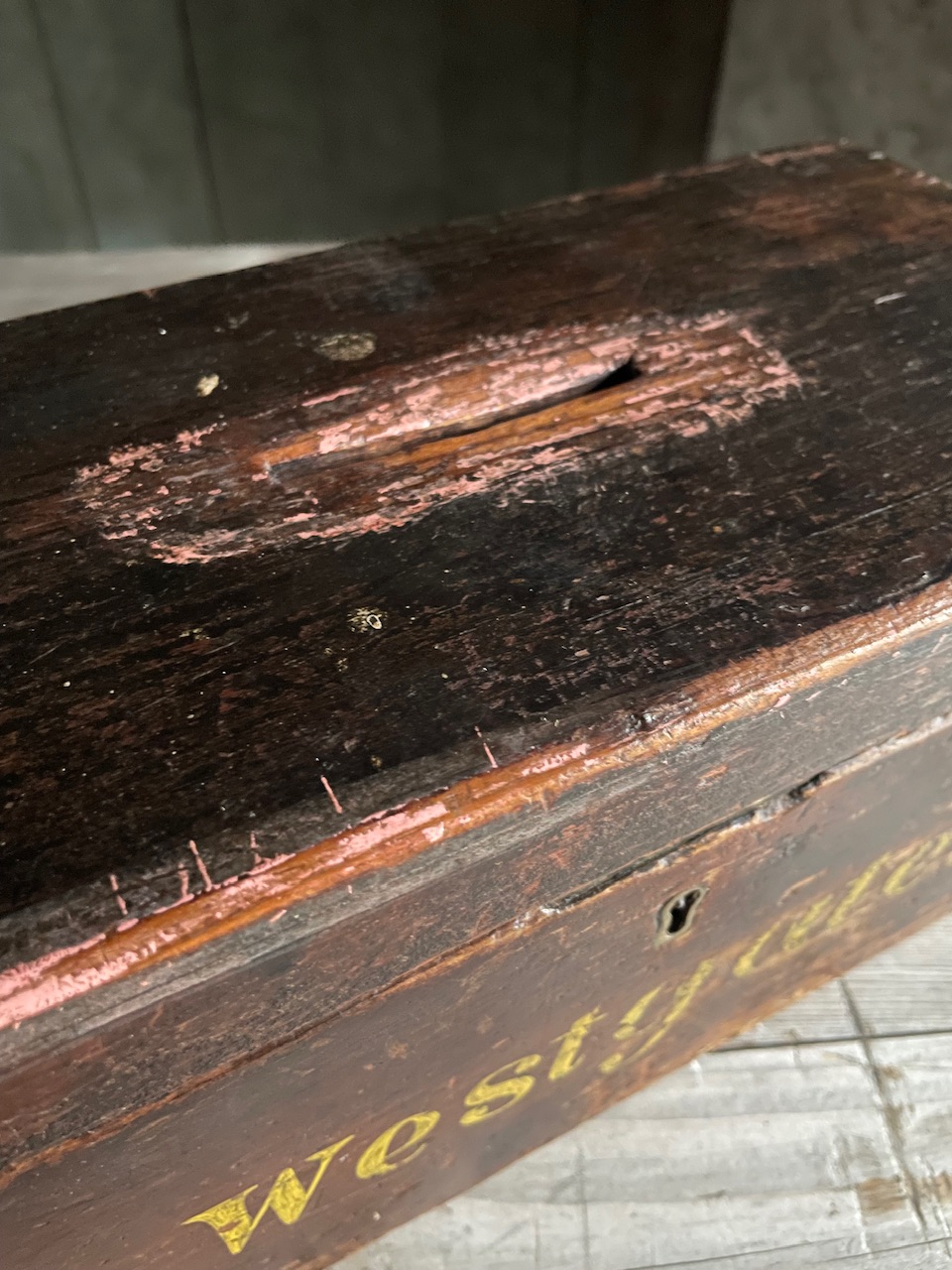 A C19th collection box from Westgate Hall, Grantham, an historic landmark in the Lincolnshire town, built in 1852, originally as a corn exchange.